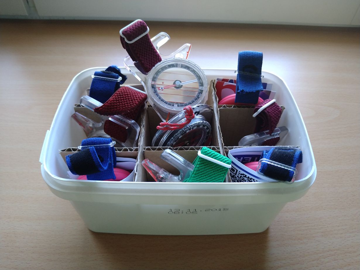 Suunnistusemitit ja -kompassit pysyvät järjestyksessä ja oikein säilytettynä tässä vanhassa juustorasiassa. Näitä ei saisi säilyttää kiinni toisissaan ja nyt tarvittava välimatka syntyy.