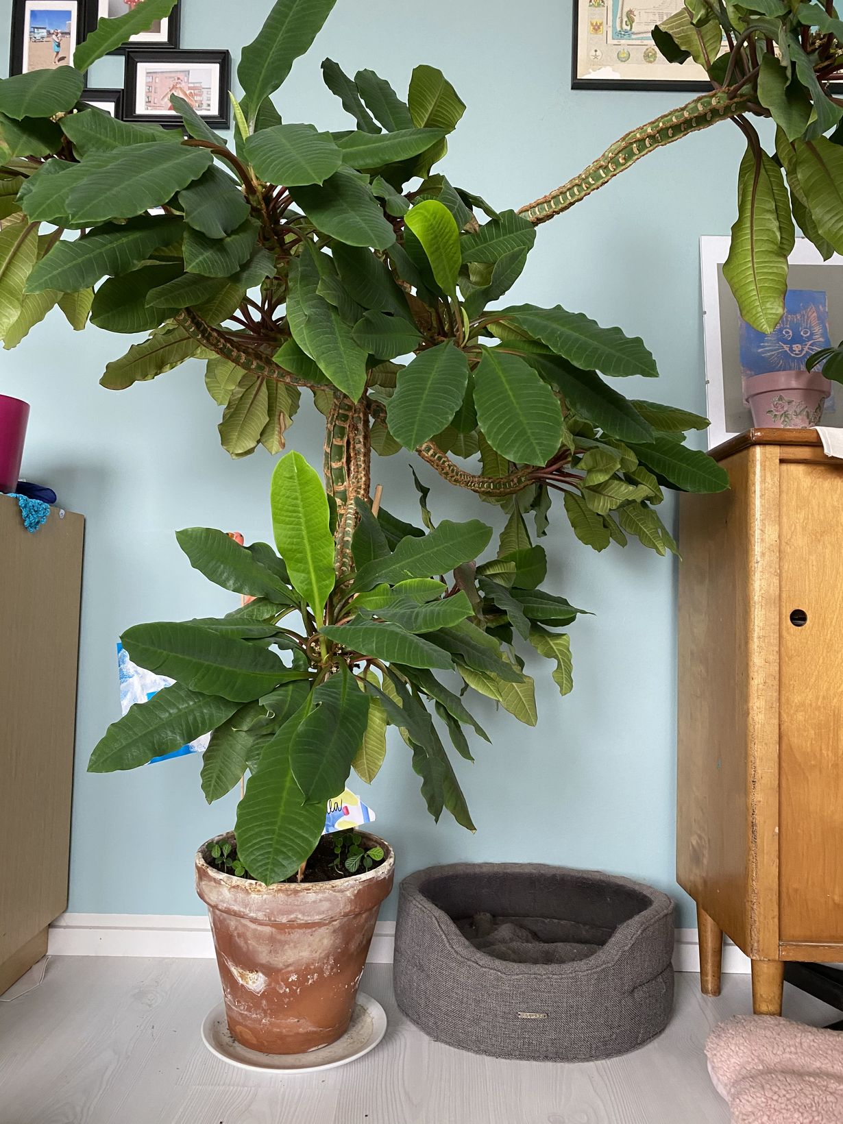 Tämä valtava nukkatyräkki löytyi pihamme roskakatoksesta saatesanoilla ”kasvoin liian suureksi, ota minut mukaasi jos tahdot” - ja minä otin! Siemeniään ympäri olohuonetta heittelevä kasvi on tuonut iloa meidän perheellemme kohta kaksi vuotta, mutta olisi mielenkiintoista tietää, mikä on tämän kasvin historia ja ikä.