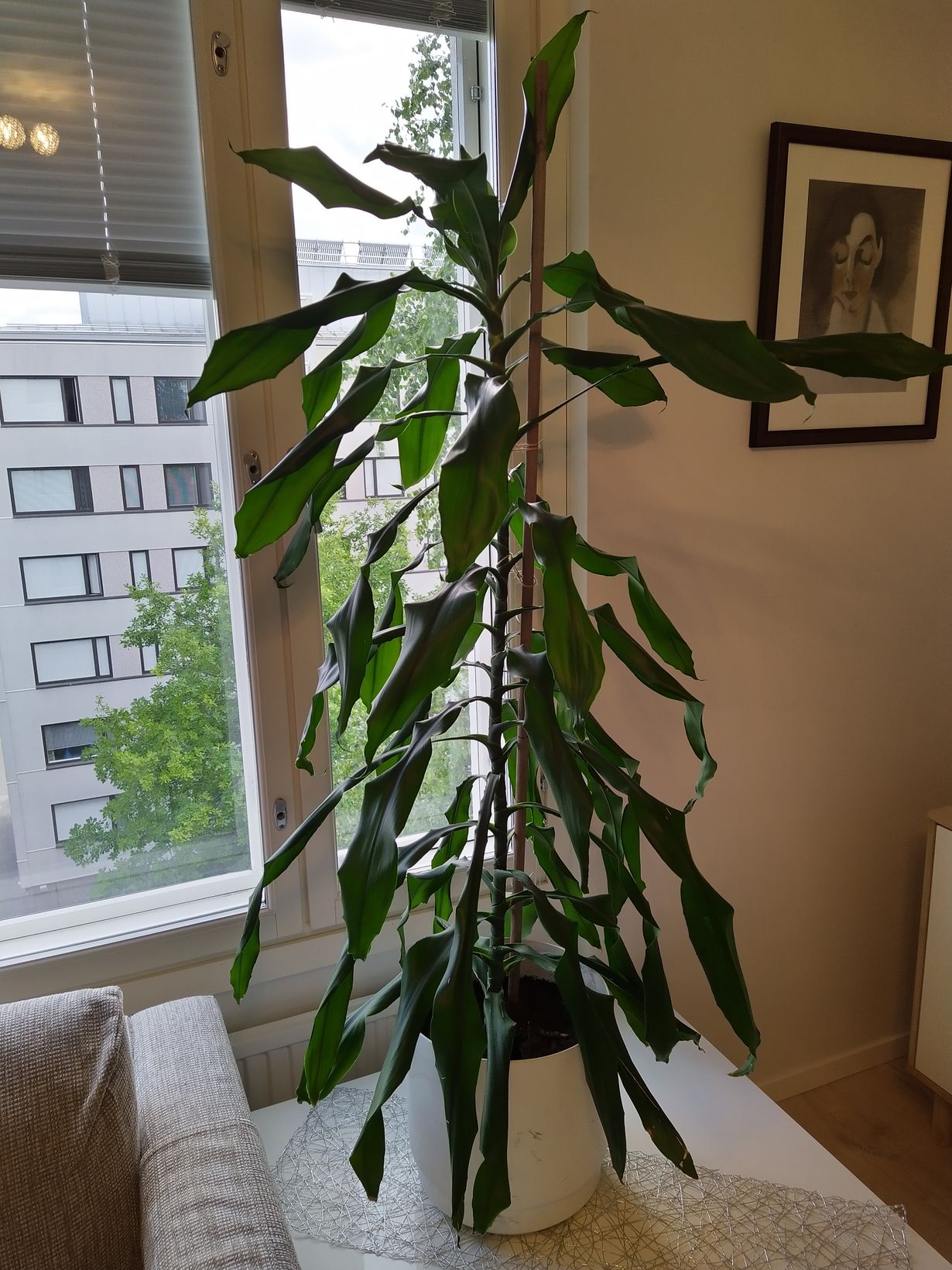 Tämä lohikäärmepuu on poikanen isommasta kukasta jonka sain kolmekymmentäyksi vuotta sitten tupaantulijaislahjaksi. Muutettuani pienempään asuntoon jouduin siitä luopumaan ja tämä jäi isoimmaksi kasviksi.