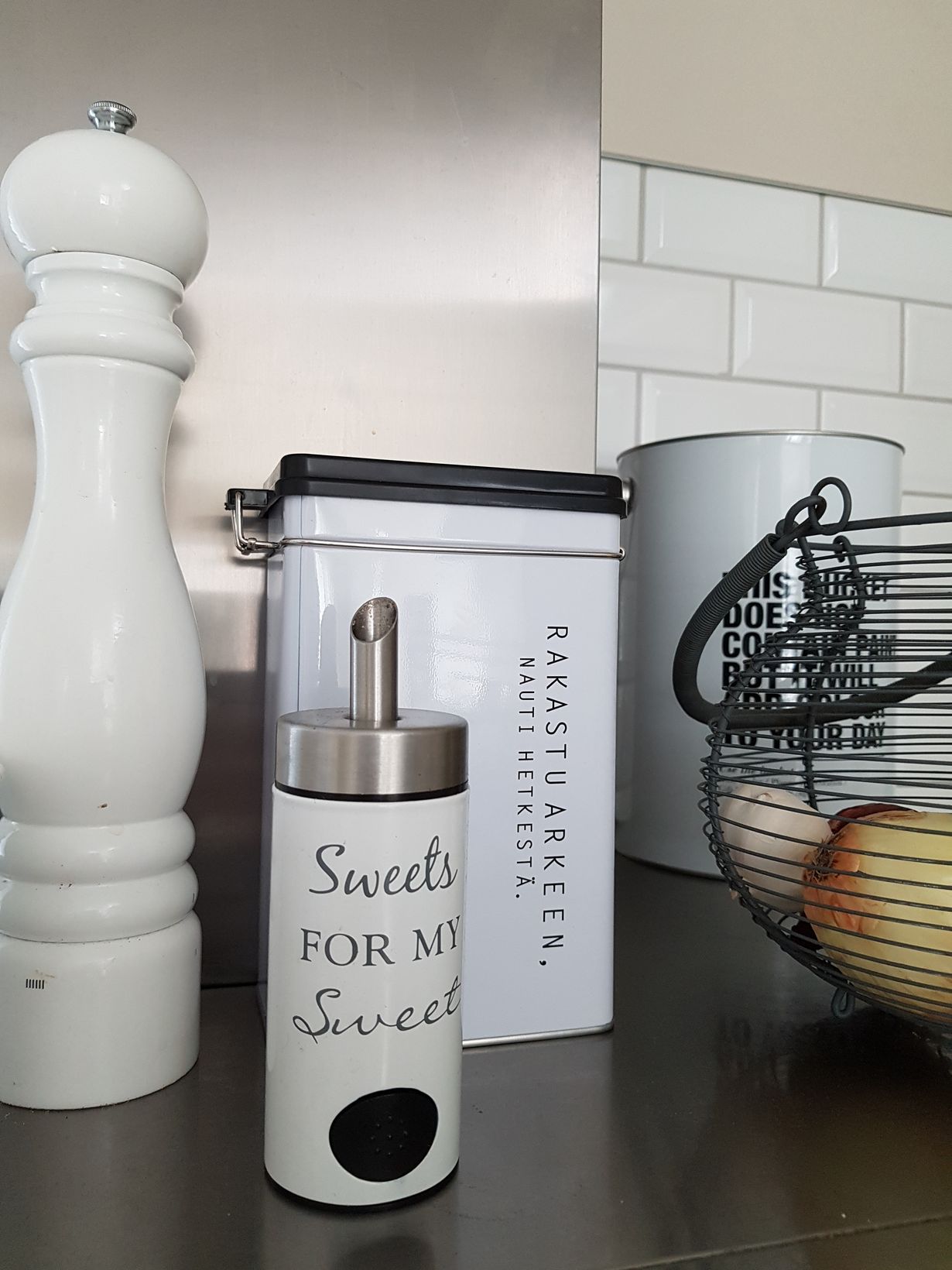 Riviera Maisonin mustavalkoinen Sweets for my sweet sokerisirotin sopii keittiömme sisustukseen. Saman käytännöllisen astian alaosaan saa myös makeutusainetabletit.