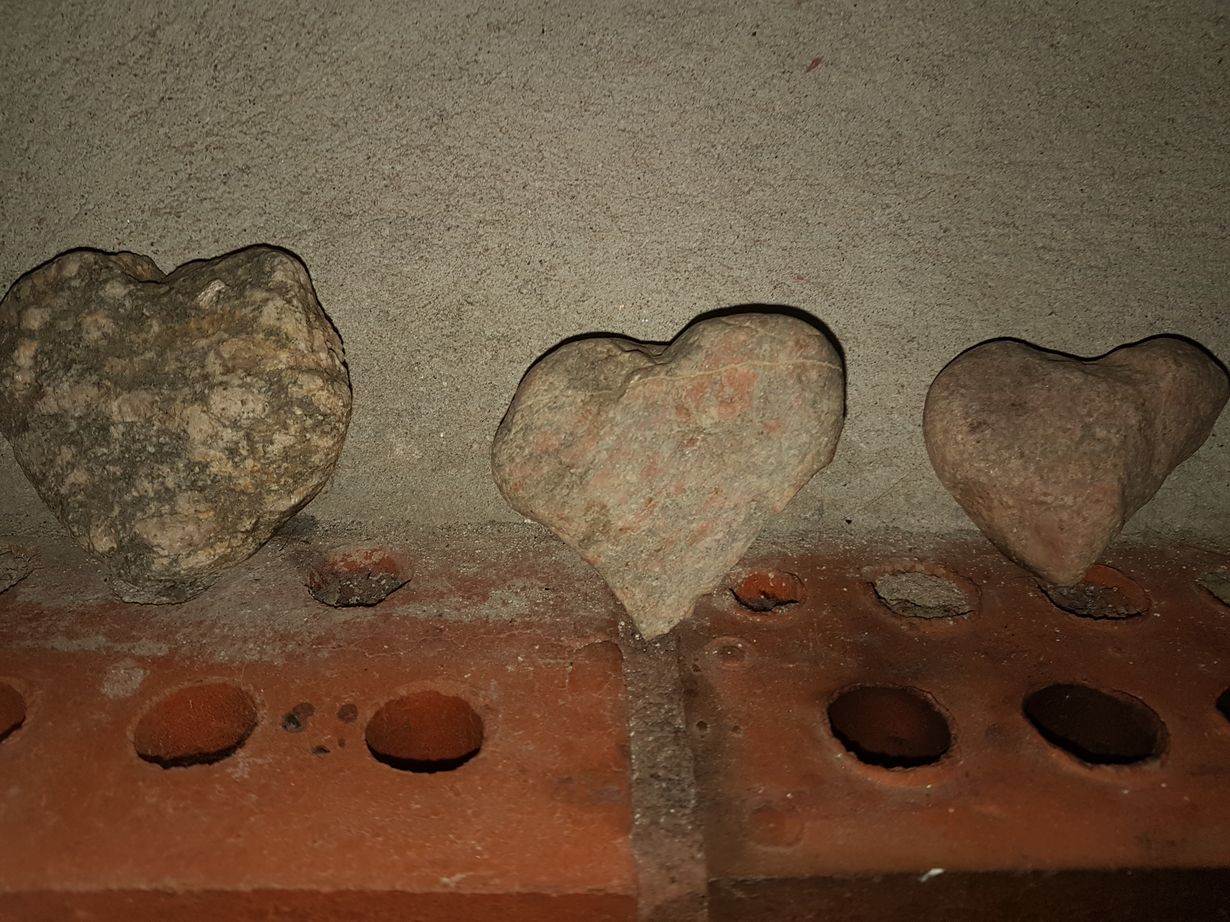 Luonnosta on löytynyt sydämenmuotoisia kiviä ja koristavat loma-asunnon pukuhuoneen takanreunalla.