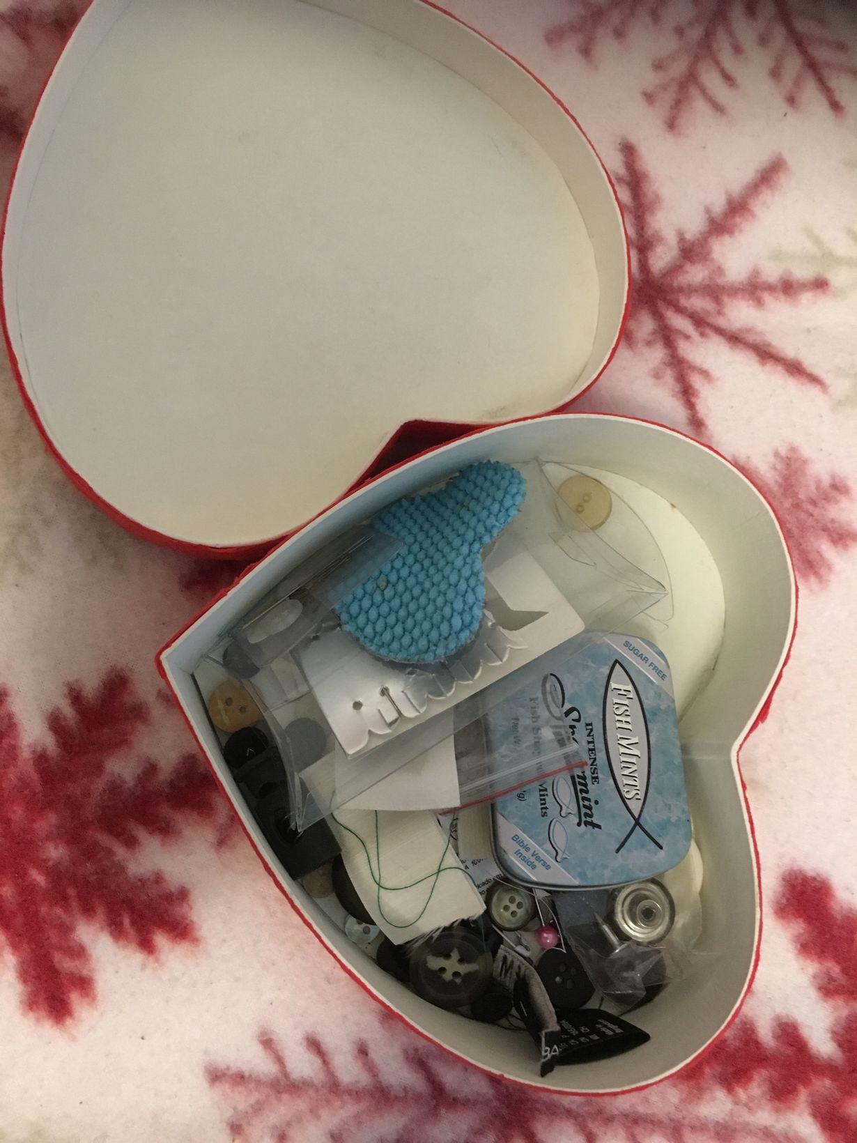 Ompelutarvikkeita on paljon, kuten rasioitakin. Tämä taitaa olla eniten käytössä. Siinä on kaikki iloisessa sekamelskassa. Tämä on kätevä ottaa mukaan, missä ompeleekaan.