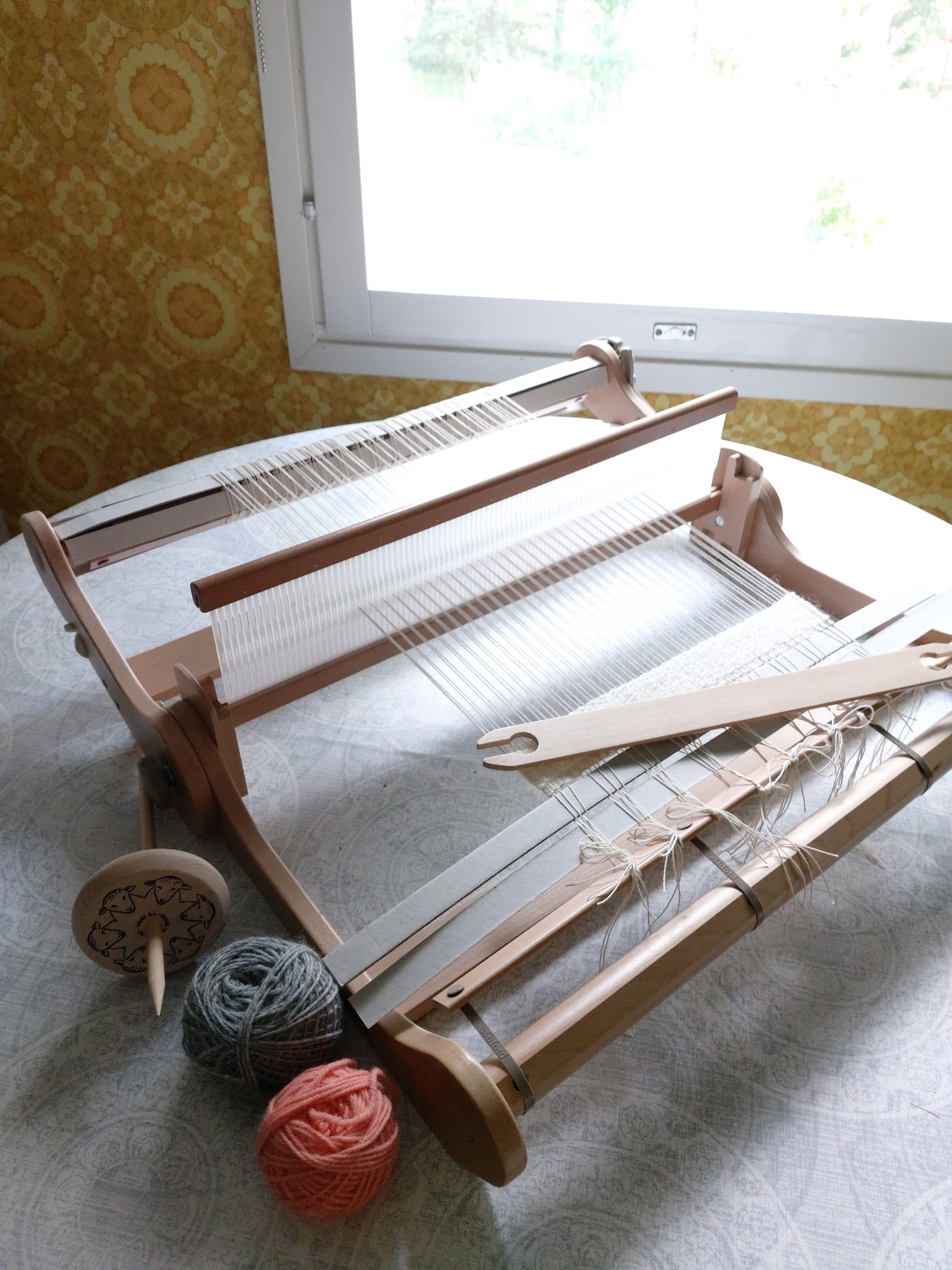 Nämä sylikangaspuut ovat monikäyttöiset, viimeisin intohimoni on pienten ryijyjen kutominen. Värttinä odottelee vieressä, että opettelen sillä kehräämään lankaa.