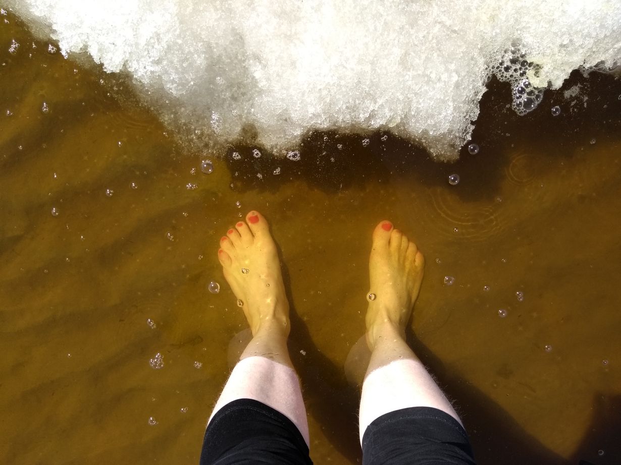 Olimme viettämässä äitienpäivää Hailuodossa, ja 5-vuotias poikani halusi hellepäivän kunniaksi rannalle uimaan. Sää oli todella tyyni ja aurinkoinen, horisontissa näkyi mantereen muodot kangastuksena ja viimeiset suuret jäälautat paukkuivat halki lämpiävän veden vaikutuksesta. Poika nautti uikkareissaan täysin rinnoin kylmästä lumesta, ihanasta säästä ja auringon lämmittämistä matalista merivesilammikoista; minä fiilistelin ensimmäistä kesäpäivää vain kastelemalla varpaani :)