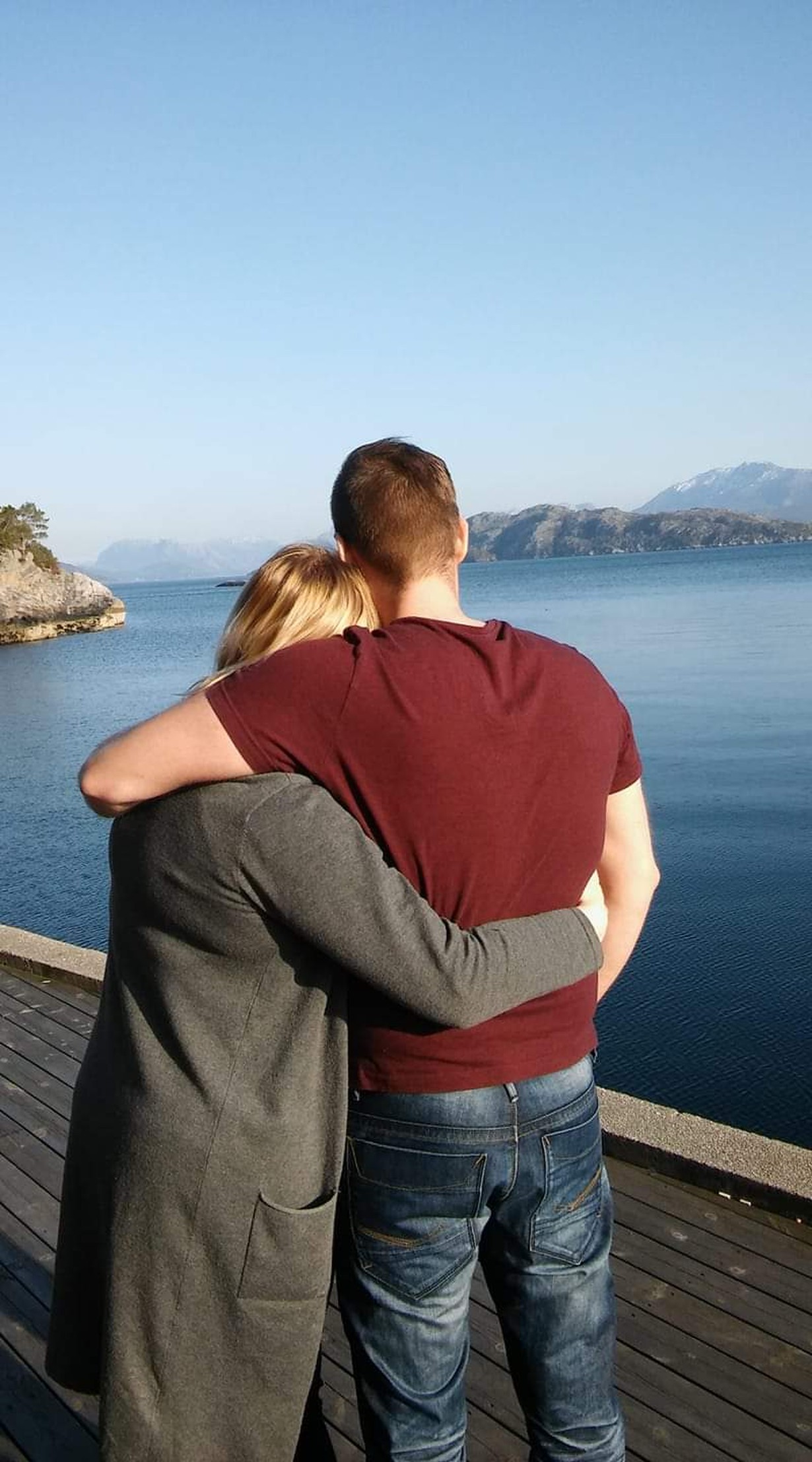 Tämä kuva on otettu 4/2019 Norjan läntisimmässä kaupungissa Florossa Atlantin rannalla. Mieheni oli siellä kuukauden työharjoittelussa ja me muu perhe menimme hakemaan hänet takaisin kotiin autolla. 3700km autossa 10 päivän aikana kolmen lapsen kanssa, hyvä me! Tämän hetkemme pian jälleennäkemisen jälkeen ikuisti 6v. tyttäremme. Kuva ei ole erityisen tarkka tai suorassa, mutta täynnä tunnetta.