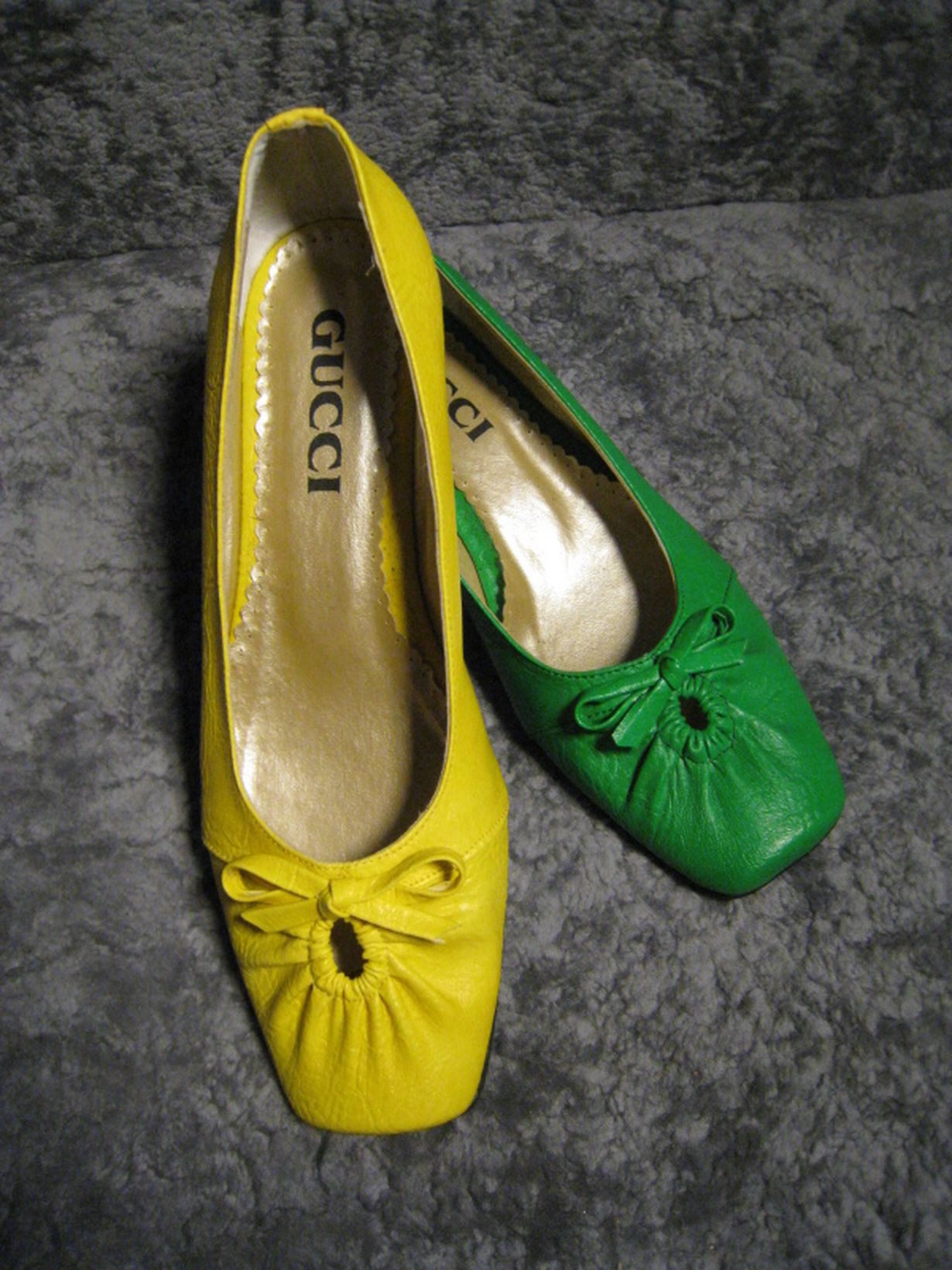 Myyjä halusi myydä keltaisen ja vihreän kenkäparin.