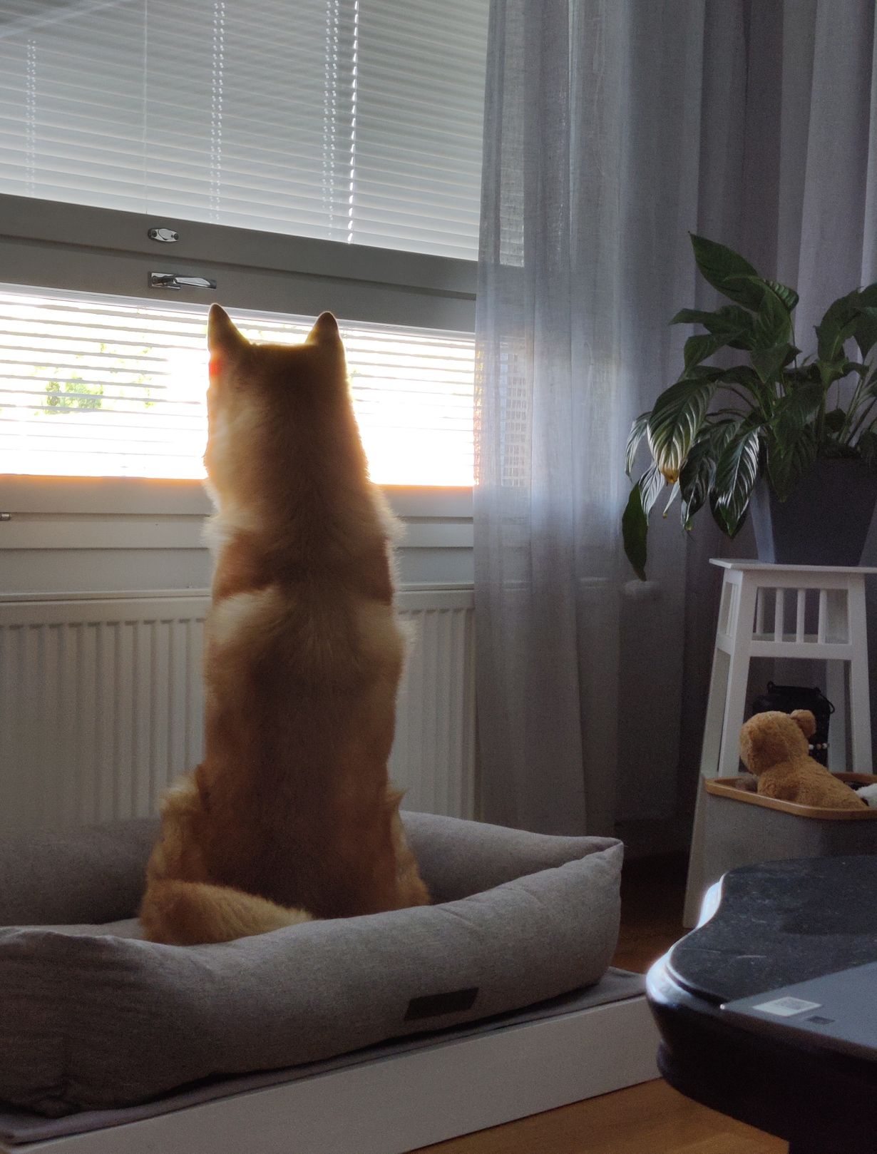 Pate nukkuisi mielellään ihmisten sohvalla, mutta siihen on porttikielto. Ostin Patelle laadukkaan ortopedisen pedin nukkumiseen, mutta siitä ei ollut yhtä hyvät näkymät ulos kun sohvalta. Isäni teki pedin alle laverin ja nyt kelpaa paitsi tähystellä ulos, myös nukkua maan pinnan yläpuolella. Se kun tuntuu olevan tärkeää.