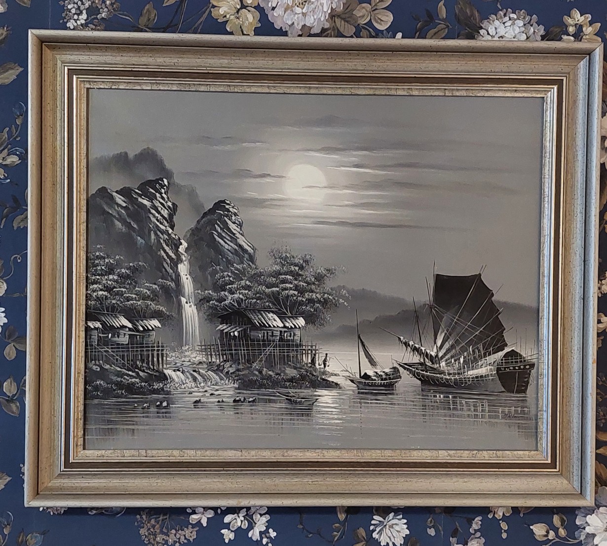Kodissamme pidän eniten tästä mieheni 1989 Hong Kongista ostamasta taulusta. Ensin rakastuin mieheen ja sitten tähän tauluun. Kun kohdistaa valon tauluun voi melkein sukeltaa kuvan mystiseen maisemaan. Kuutamo,meri ja pienen Hong Kongilais kylän elämänmeno.