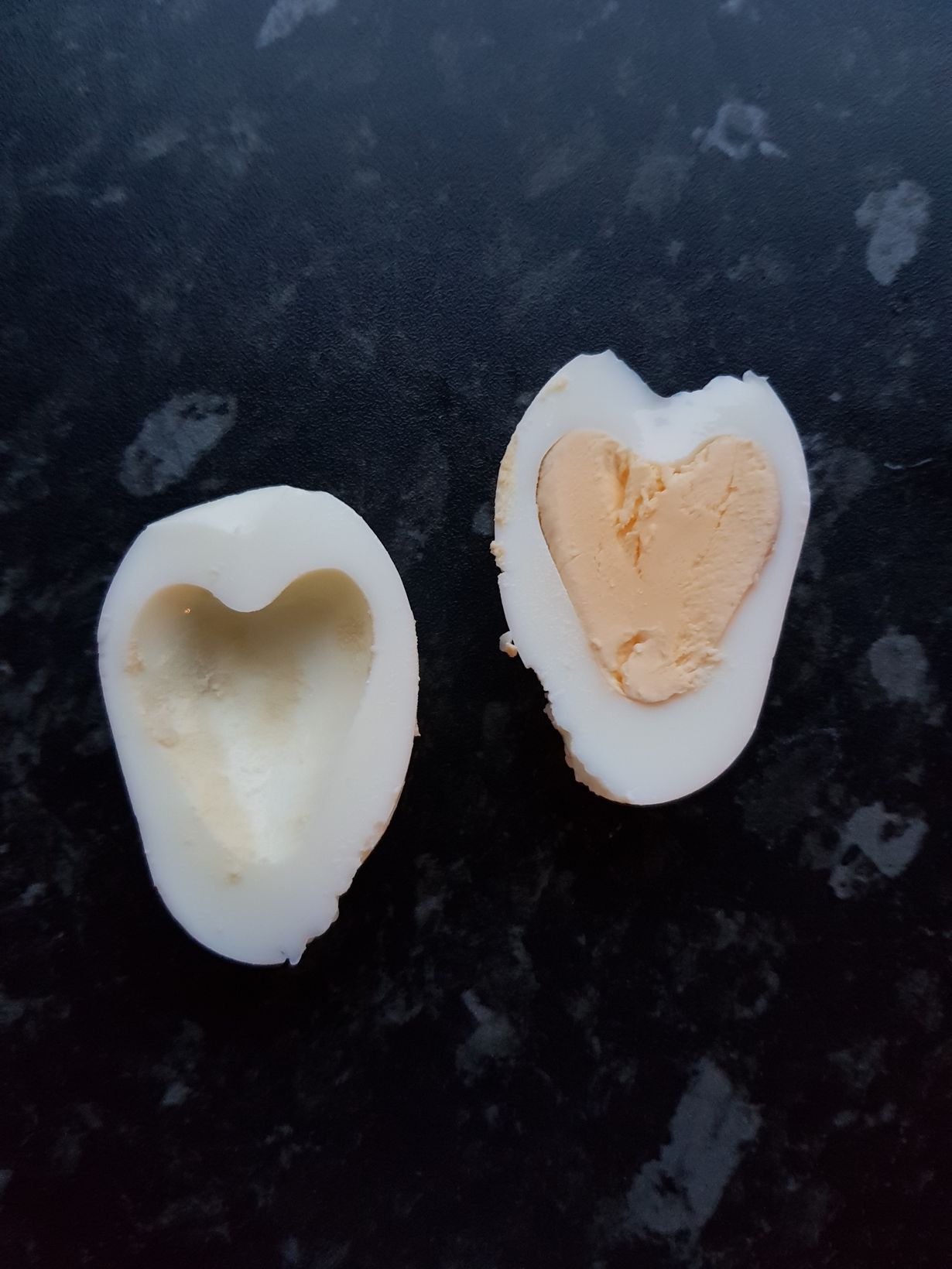 Kananmuna kopsahti hieman rikki kattilaan mennessä ja aukileikatessa paljastui hieno sydämenmuoto. Piristi päivää ja valoi uskoa kokkaustaitoihin ?