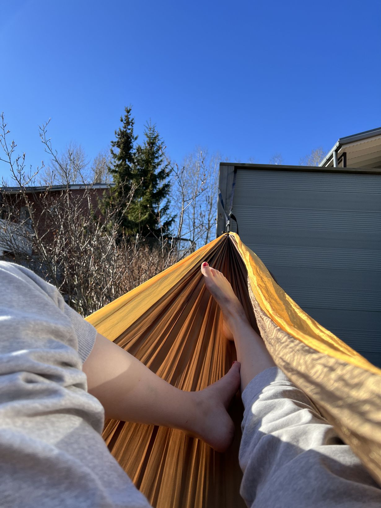 Lähetä kuvakisaan kuva riippumatostasi - voita Familonin vuodevaatteita! Takapihalla pötköllään Hanna Roihuvaara 6.6.2024 klo 14:56 Vaikka takapiha olisi pieni, onneksi aidantolppiin saa juuri ja juuri ripustettua riippumaton.