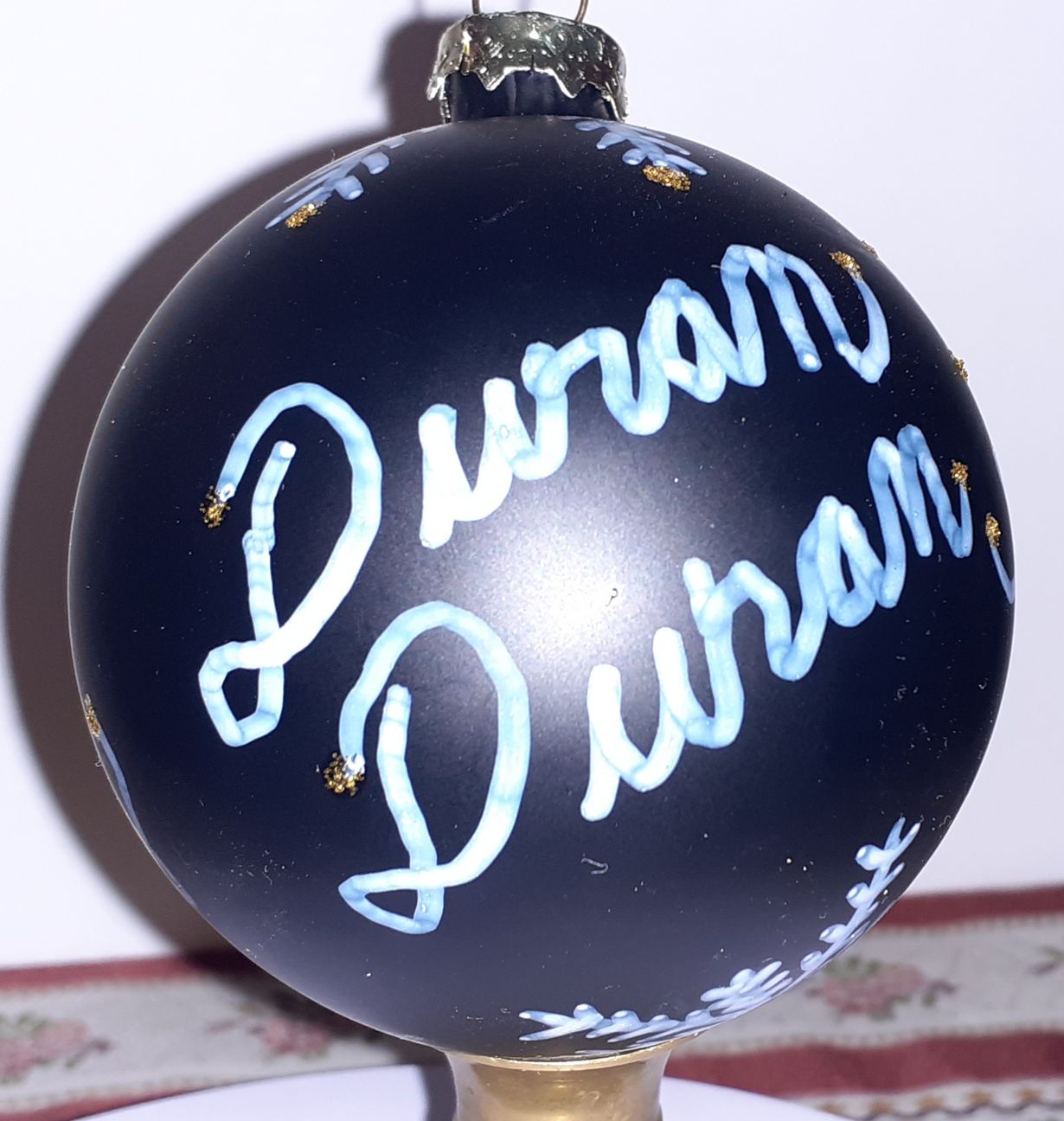 Kuva tekemästäni joulupallosta. Tämä pahe on ollut elämässäni kohta 40 vuotta. Eli kyseessä on pallon kyljessä komeileva yhtyeen nimi. Välillä olen pystynyt addiktioni kätkemään hyvin ja pitämään piilossa. Tänä vuonna se on näkynyt elämässäni enemmän. Minä en kyllästy varmaan koskaan itse, mutta jotkut muut voivat vain huokailla...