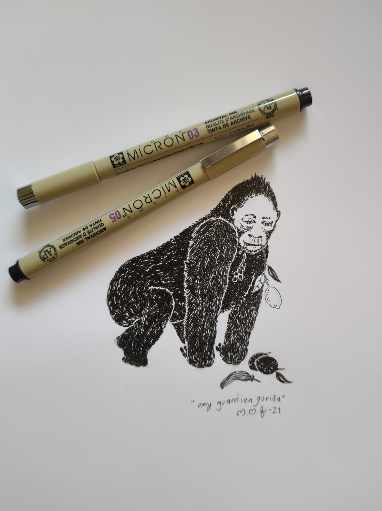 Tykkään piirtää eläimiä, karhuja ja gorilloita. Lisään kuviin jotain pientä luonnosta, esimerkiksi hedelmiä tai kasveja. Luonto ja eläimet inspiroivat, niitä pitäisi arvostaa ja suojella. Käytän japanilaisia Sakura Pigma Micron tusseja, niillä saa siistiä jälkeä eikä muste haalistu valosta. Piirrustus on kiva harrastus, se on terapeuttista ja ongelmat unohtuvat hetkeksi.