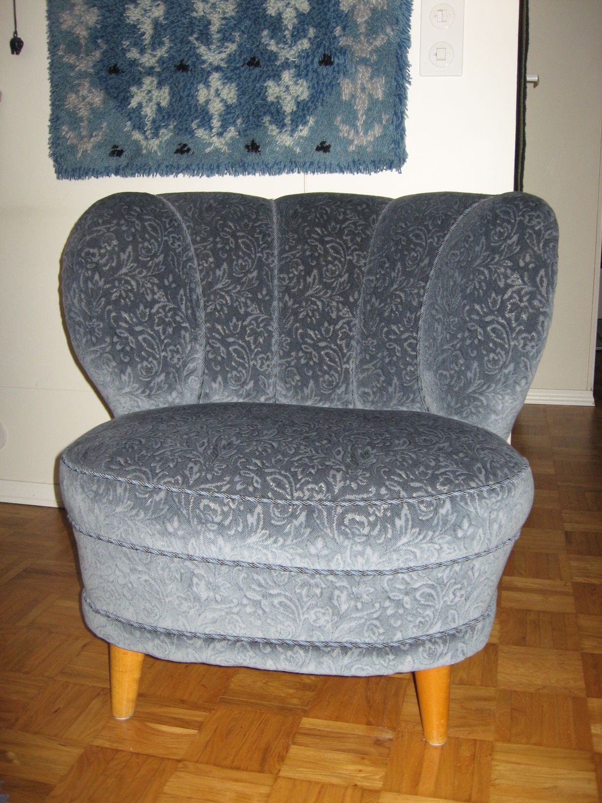 Tämä nojatuoli kuuluu vanhempieni 1950-luvulla ostamaan sohvakalustoon, johon kuuluu myös sohva ja toinen nojatuoli. Kalusto on minulla käytössä, se on hyväkuntoinen, kaksi kertaa uudelleen verhoiltu (kaikista kolmesta verhoilukankaasta on tilkut tallessa). Tietääkseni kaluston nimi on Lordi.
