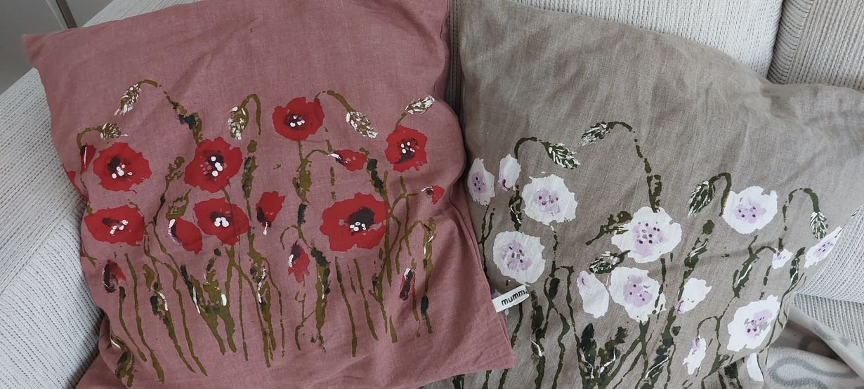 Viime kesälomareissulla Etelä-Pohjanmaalla sattumalta osuimme Mummadesign myymälään, jossa nämä ihanat tyynynpäälliset odottivat minua.