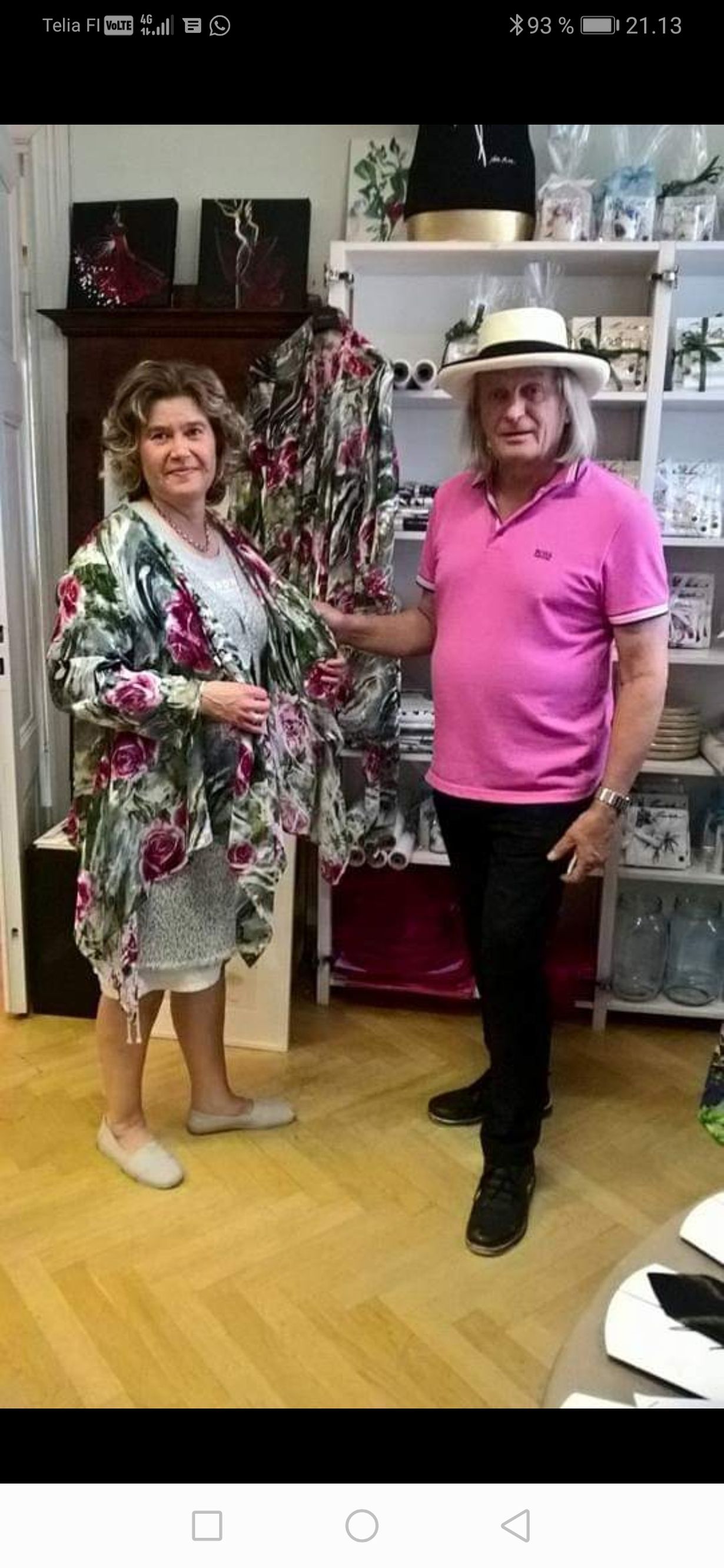 Tapasin Jukka Rintalan pari vuotta sitten Naantalissa omassa näyttelyssään.Hän itse sovitteli päälleni kuvassa näkyvää tunikaa.Kauppoja siitä ei tullut mutta servettejä ja kaitaliinoja ostin.