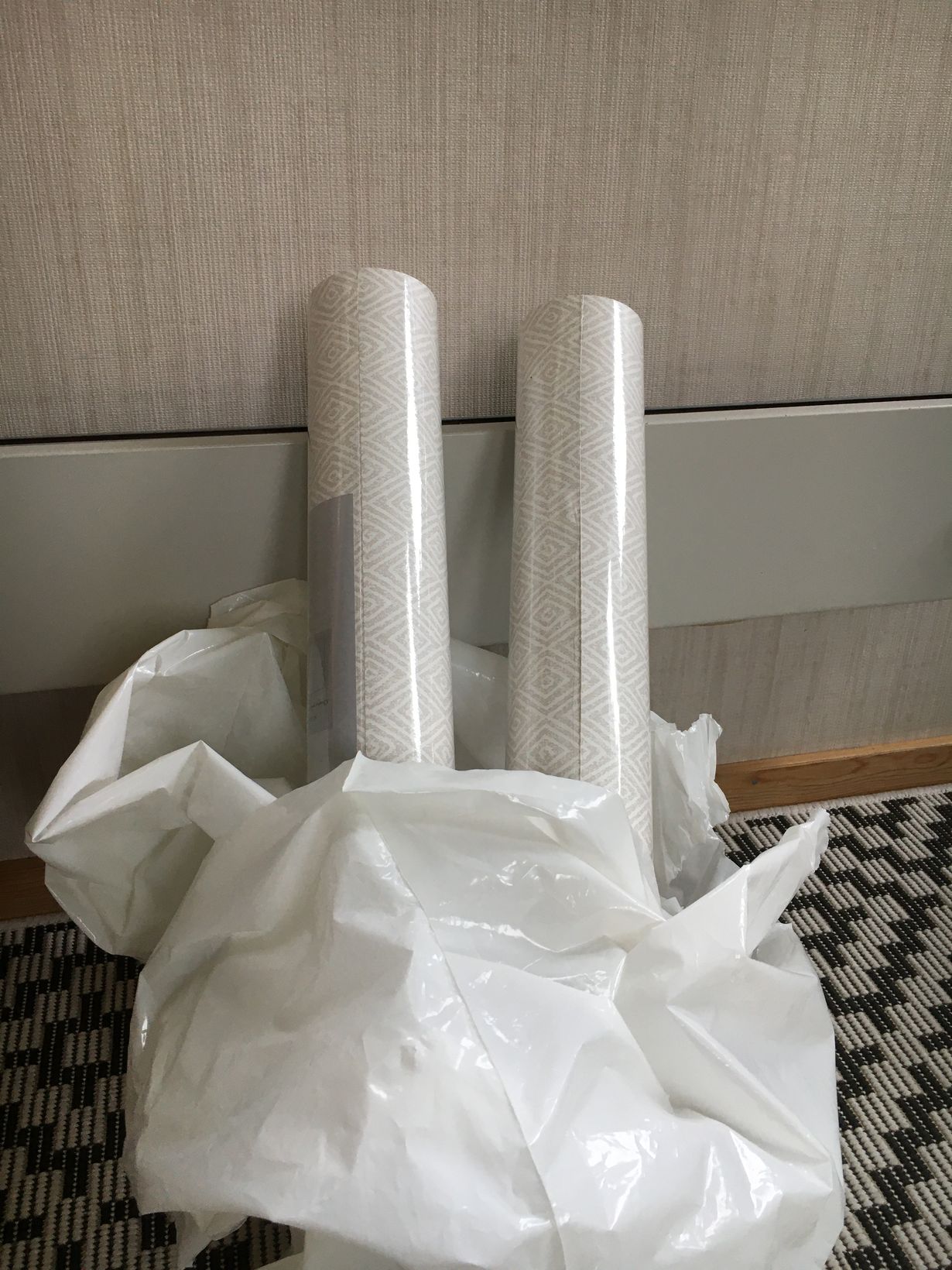 Viisi vuotta nämä tapetit rullissaan ovat odottaneet pääsyä kuistimme seinälle. Miksi ihmeessä en jo ole sitä tehnyt? Uusi iso peilikin odottaa sijoituspaikkaansa.