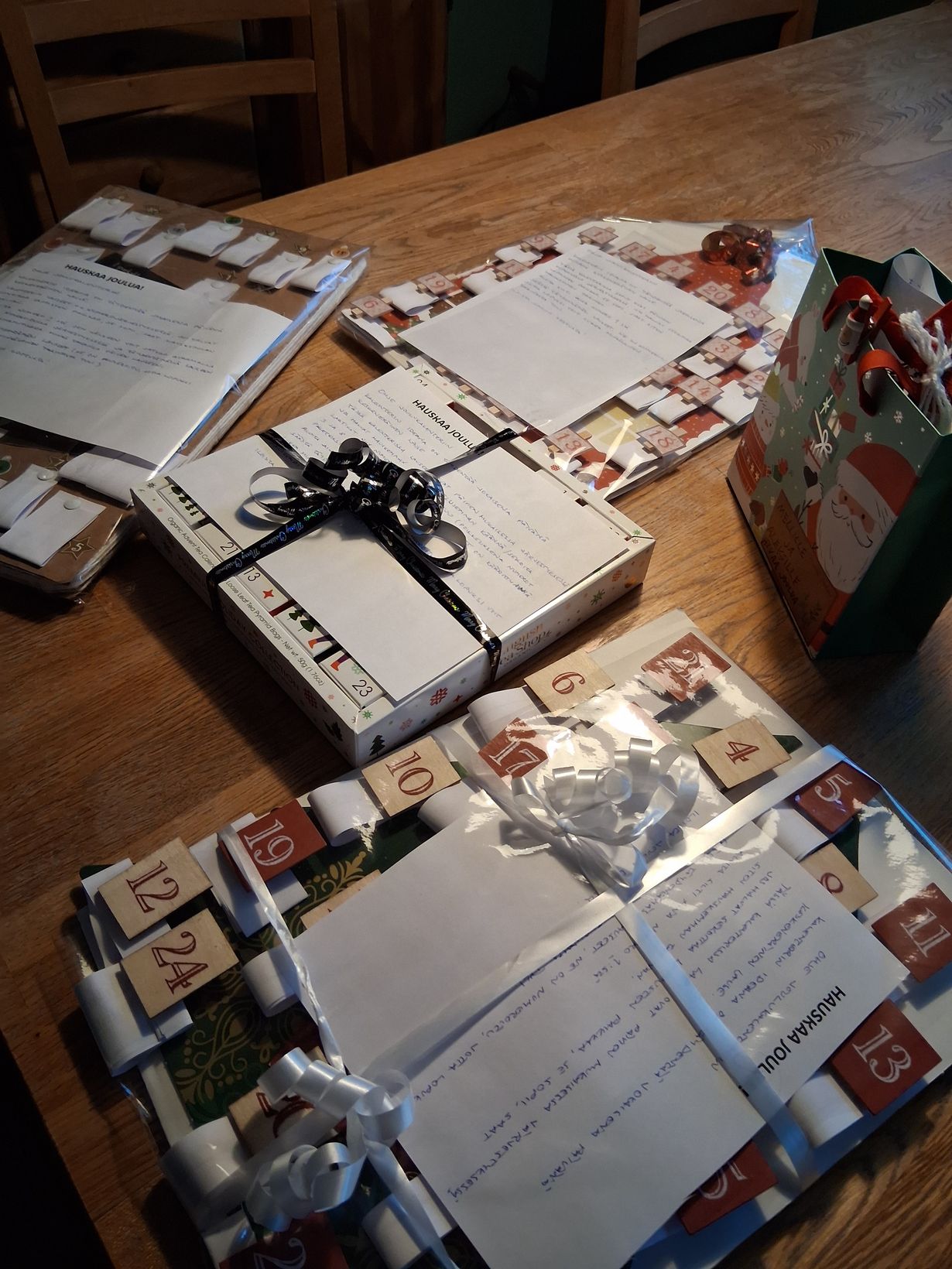 Keksin täydennettävän kertomuksen, joka päivällä oma lauseensa, lopuksi siitä muodostuu kertomus. Kalentereihin käytin kaikki entiset kalenterit kaappien kätköistä. Kirjoitin vielä ohjeet mukaan.