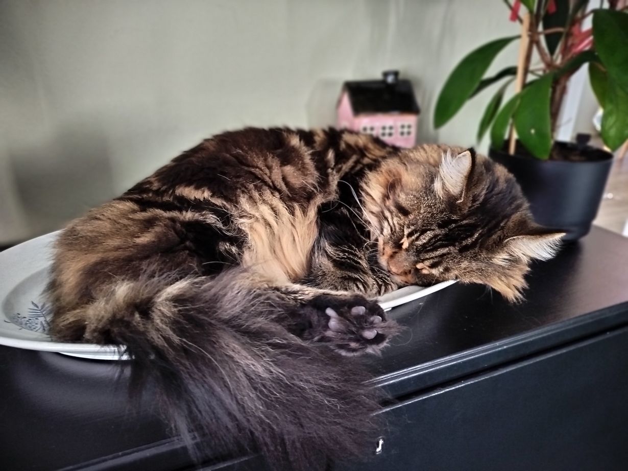Tällä vadilla tykkäävät molemmat kissamme nukkua. Tarjoiluvati on olohuoneessa lipaston päällä, joten lienee sopivan keskeinen paikka olla siellä missä muukin perhe.