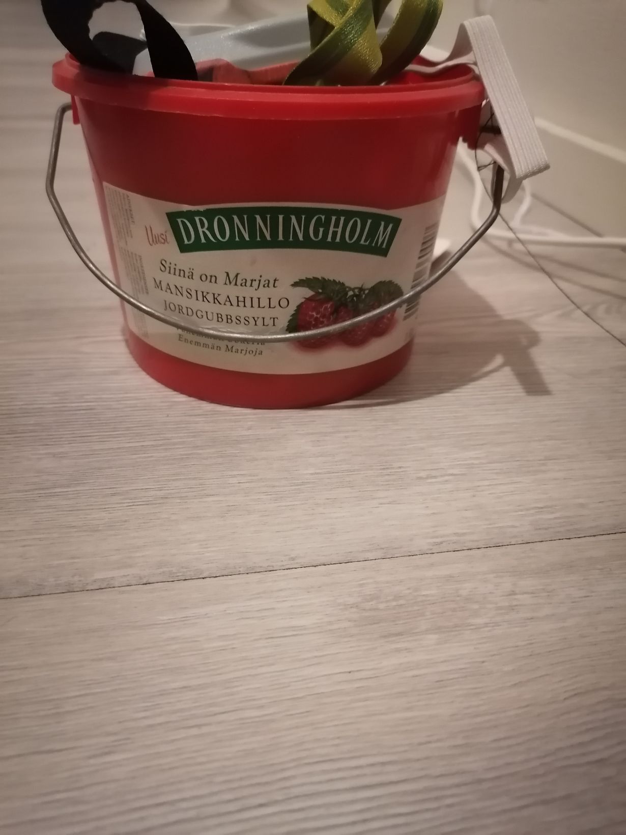 Tämä n.20 vuotta vanha hillopurkki on ollut kaapissa niin kauan kun jaksan muistaa. Siinä on aina säilytetty neuloja, lankoja nappeja ja kaikkia pieniä tarpeellisia esineitä. Aina kun joku asia hukassa katsotaan kaappiin hillopurkkiin.