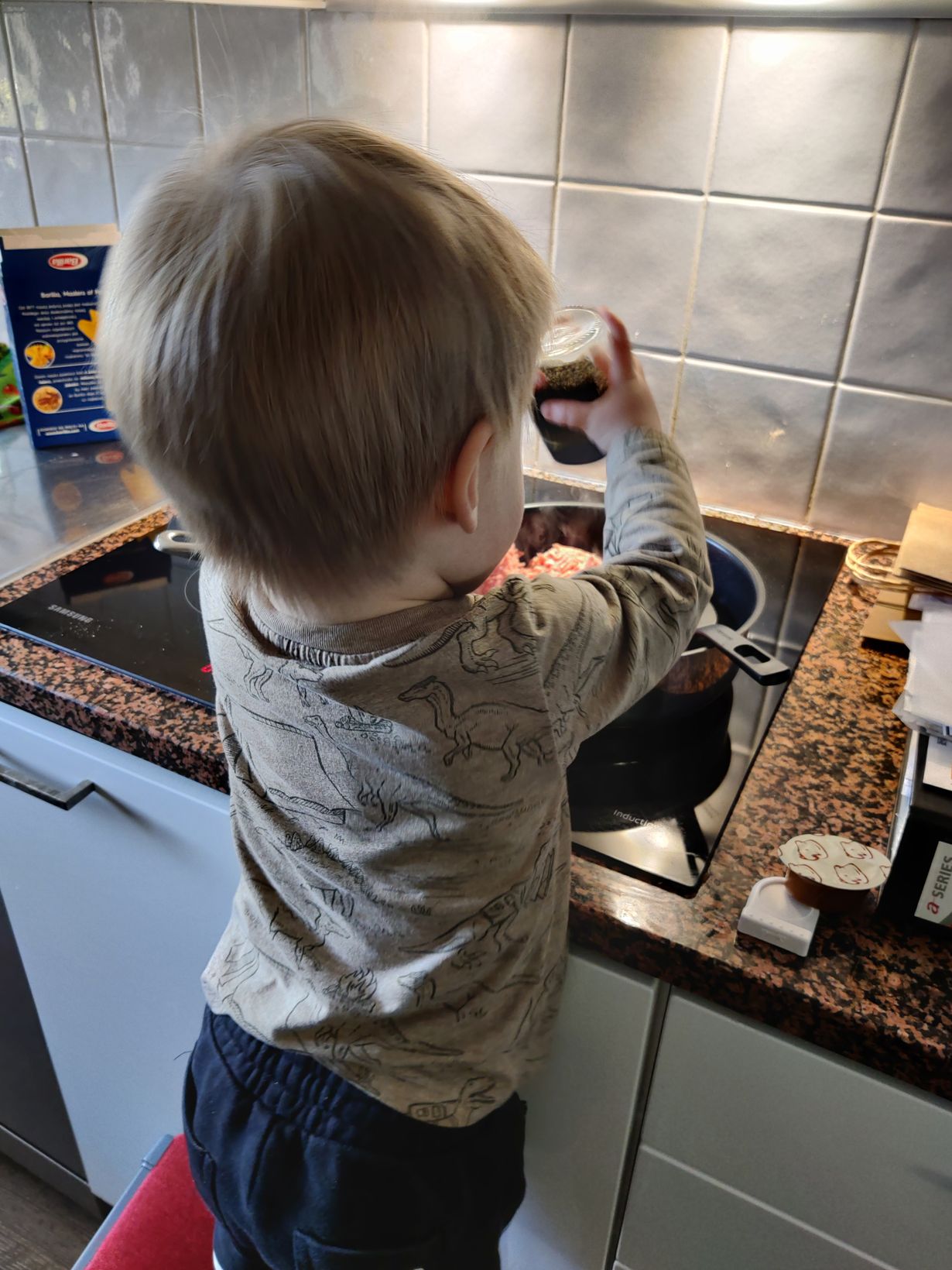 Tärkein keittiöapurini on esikoisemme, joka pitää tarkasti huolen siitä, että saa osallistua jokaiseen mahdolliseen keittiöhommaan.