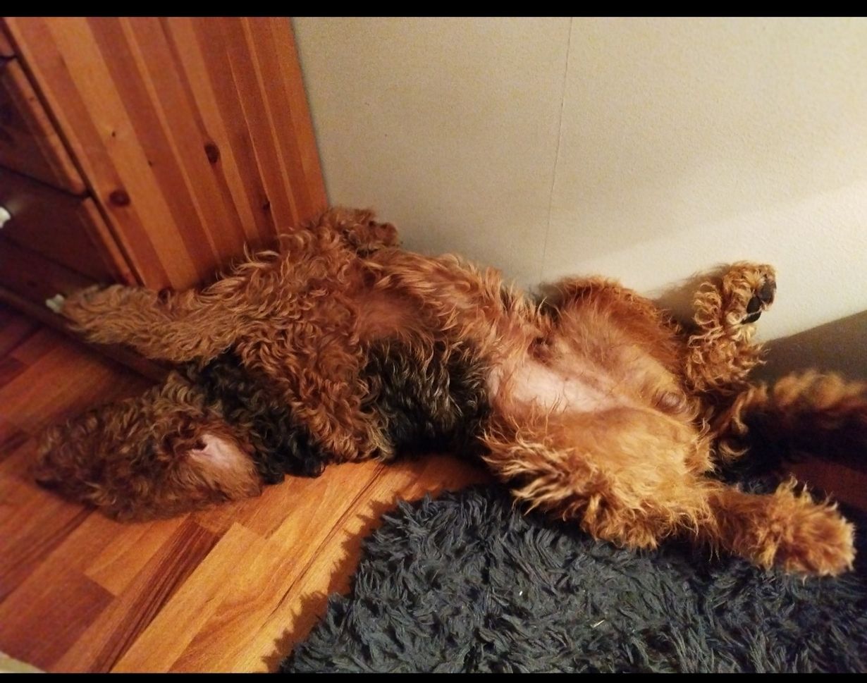 Tarmolle tehtiin peti mamman sängyn viereen kun se muutti meille asumaan. Edelleen se änkee itsensä pieneen tilaan mamman lähelle. Sille ei kelpaa peti, vaan se raapii pedin pois ja rojahtaa kovaäänisesti paljaalle lattialle. Kuvassa Tarmon lempiasento.
