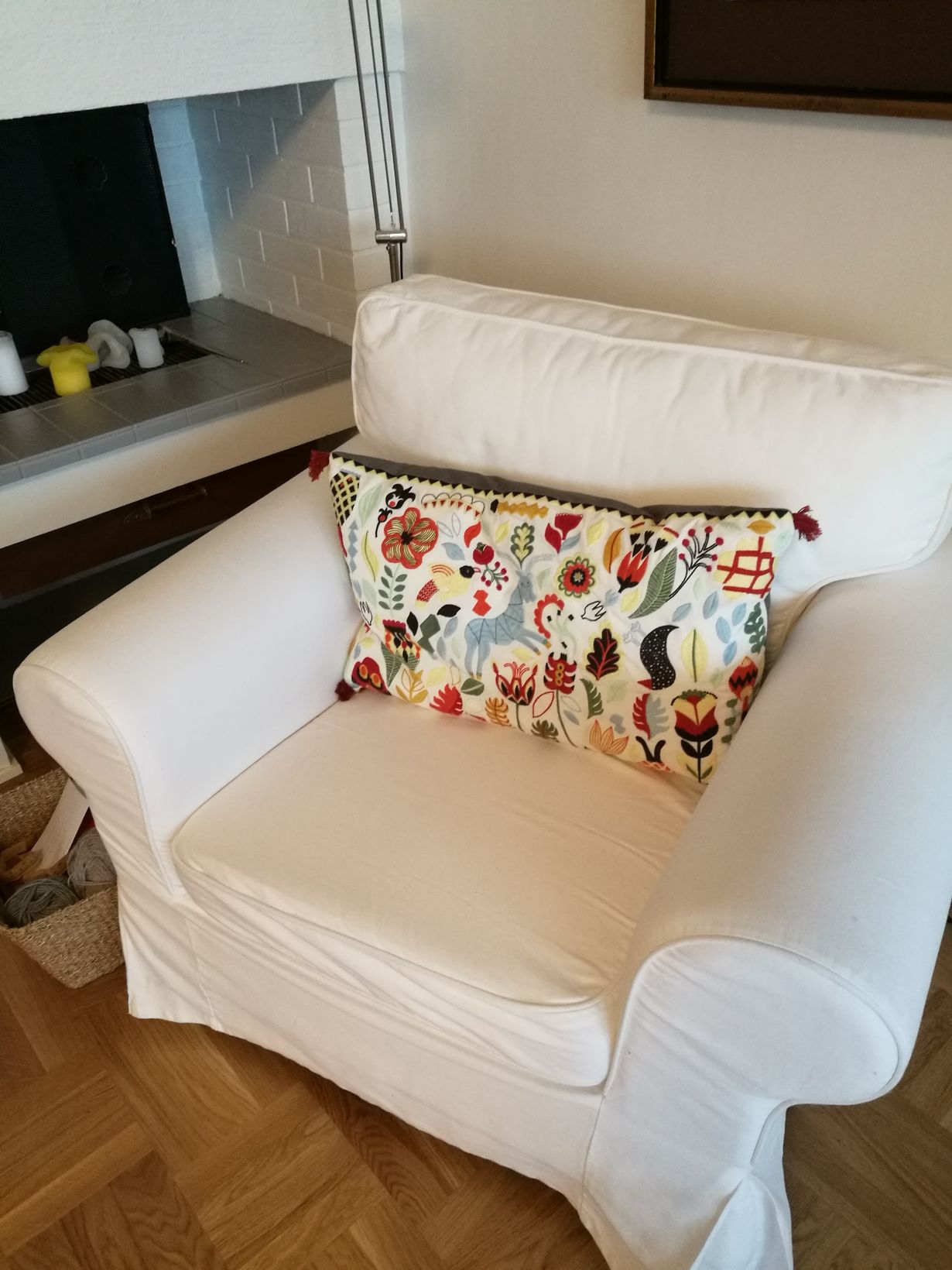 Tässä nojatuolissa on syntynyt aika monta sukkaparia sekä lapasia. Tuolista on näkymä lähes koko kotiin ja takassa palavat kynttilät tuovat tunnelmaa.