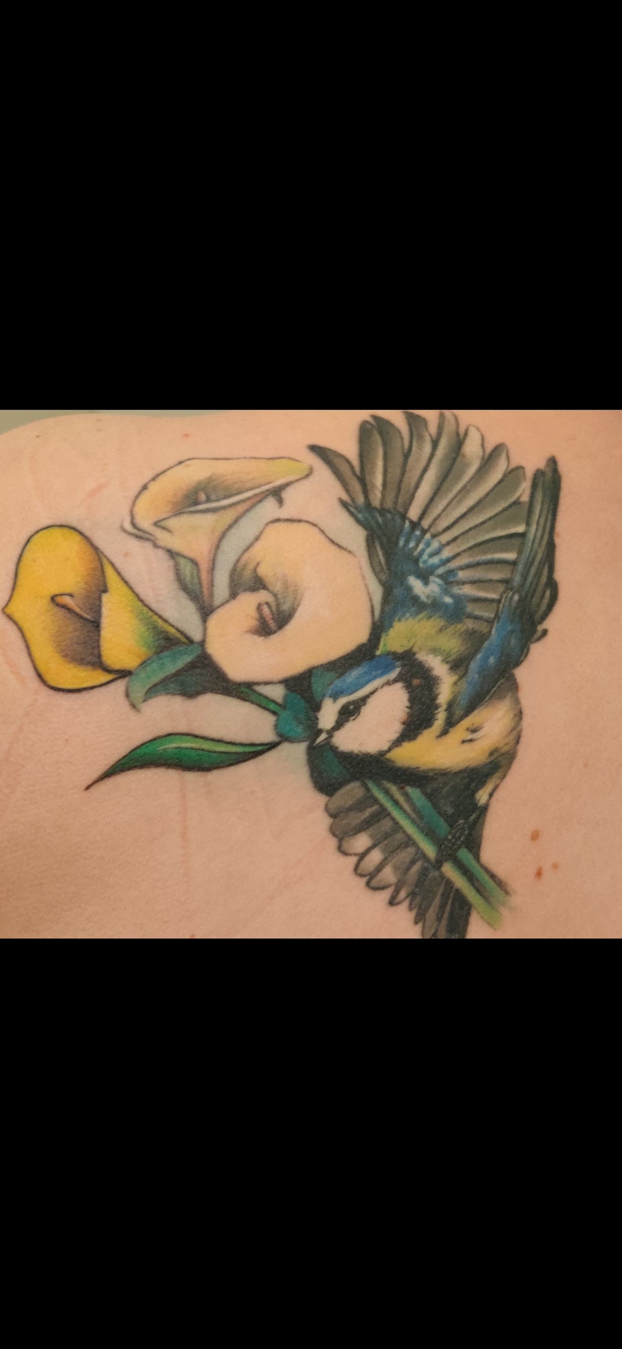 Rakkaan mummuni kuoleman jälkeen erinäisistä tilanteista on jäänyt vahva tunne siitä, että mummu on syntynyt uudelleen pikkulintuna ja suojelee minua ja lapsiani minne menemmekin. Linnun siipien suojassa olevat kukat kuvastavat kolmea lastani.