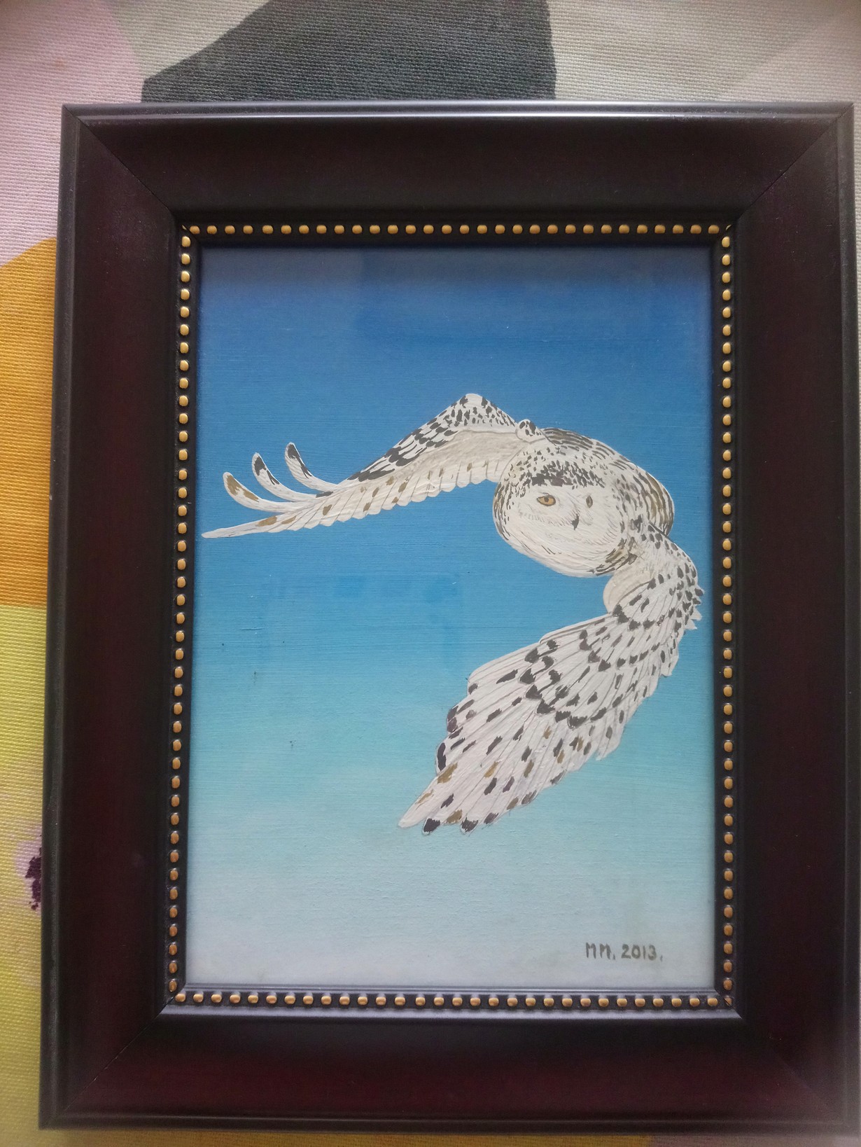 Olin äitini kanssa Grönlannin Nuukissa kesälomareissulla vuonna 2013. Yhtenä iltana kävimme paikallisessa pubissa ja vanha mies tuli juttelemaan. Yhteistä kieltä ei löytynyt mutta mies oli niin hyväntuulinen ja selvästi innostunut että olimme "eksyneet" Nuukkiin, sielä kun ei turisteja liikaa käy. Mies otti tämän taulun ison takkinsa taskusta ja antoi meille. Ei pyytänyt rahaa siitä, halusi vain antaa lahjaksi. En tiedä oliko taulu hänen itse maalaamansa mutta hyvä mieli tapahtuneesta jäi ja reissu oli muutenkin mahtava kokemus.