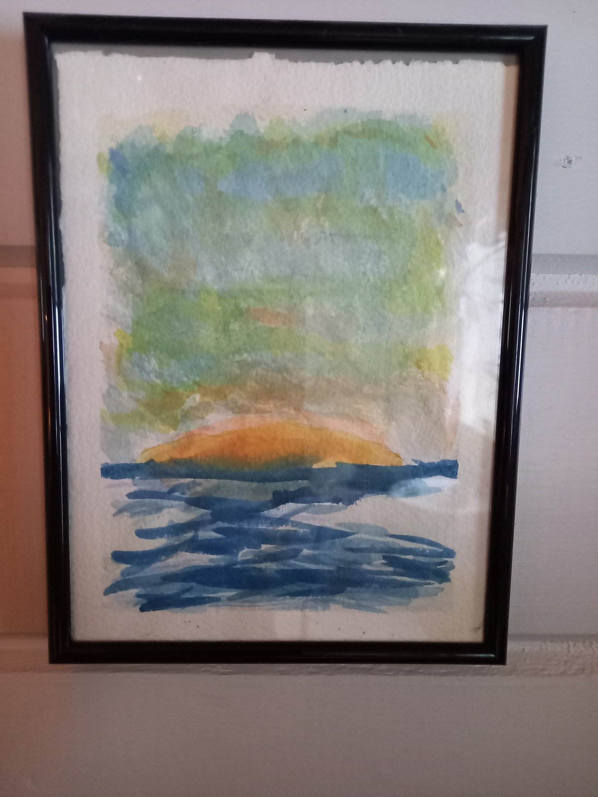 Tämän kuvan on maalannut tyttäreni n 8-9 vuotiaana. Jostain syystä se miellyttää minua kovasti ja miellyttää kotona olevista tauluista eniten. Tytär on nyt jo 24 v.