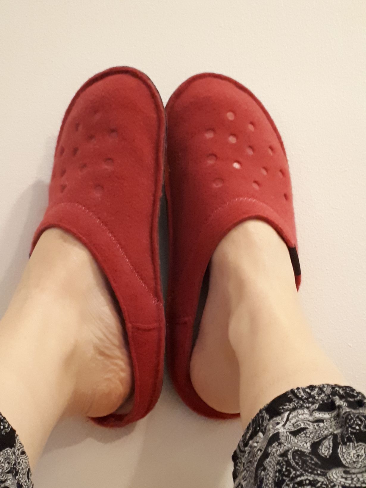 Saan mieheltäni yleensä joululahjaksi perin "littania" lahjoja: lahjakortteja kosmetologille tai hierojalle, valmiiksi suunniteltuja matkoja tai vastaavaa. Ne on paketoitu laatikkoon "täytelahjojen" kanssa. Täytelahjan virkaa toimittivat kerran nämä huopacrocsit.