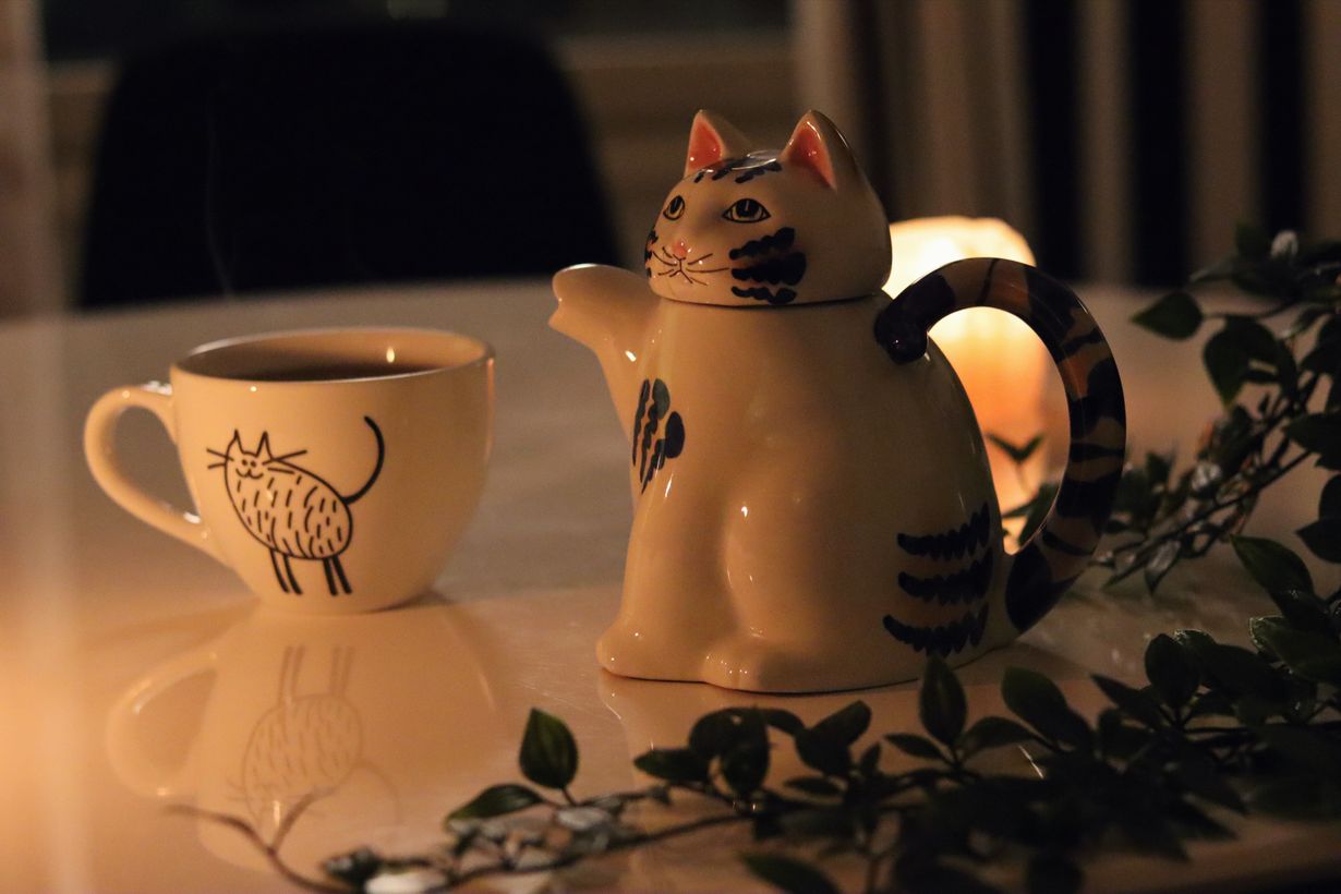 Kissateekannu on jäänyt entiseltä poikaystävältä. Hän oli löytänyt sen joskus kirpputorilta. Sen pää on joskus tippunut ja haljennut, mutta korjattu liimalla. Myös kissamukiin liittyy entinen, vielä aiempi poikaystävä, joka osti sen puolalaisesta supermarketista lahjaksi. Olen säilyttänyt molemmat, koska ne ilahduttavat minua.