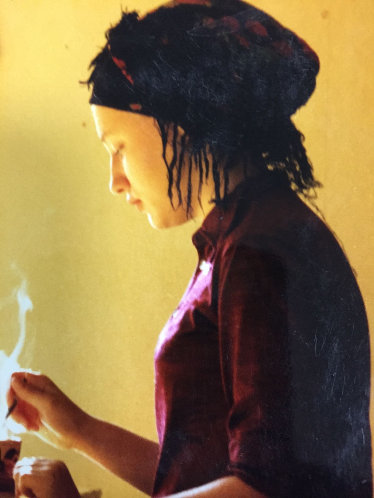 Tässä äitini ottamassa kuvassa kaun sitten jäähdyttelen teetä ... äitini kuvasi meitä pienenä aina arkitilanteissa ja tämäkin näyttää nyt vuosien jälkeen tsidekuvalta...huivi on päässä siksi koska teininä tukka ei ollut koskaan hyvin. Todellisuudessa omistin kiiltävän paksun ja mustan kahvin värisen hiuskuontalon joka on ohentunut niin että olen sen leikkauttanut polkaksi.