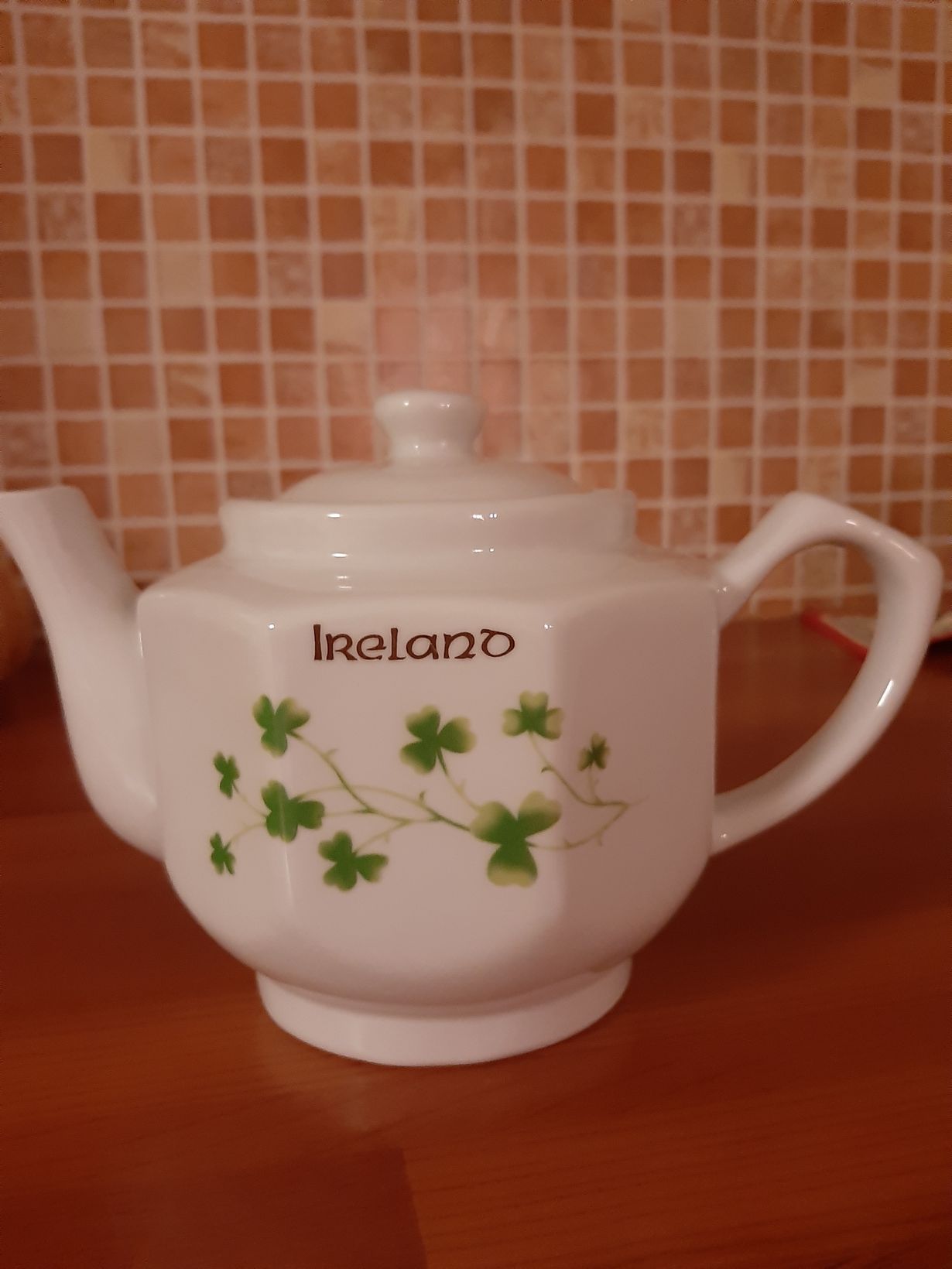 Ostin pannun Irlannin matkalta vuosia sitten. Apila on Irlannin kaunis kansalliskasvi, joka liittyy pyhään Patrikiin, Irlannin suojeluspyhimykseen. Hän opetti sen avulla pyhää kolminaisuutta kansalle.