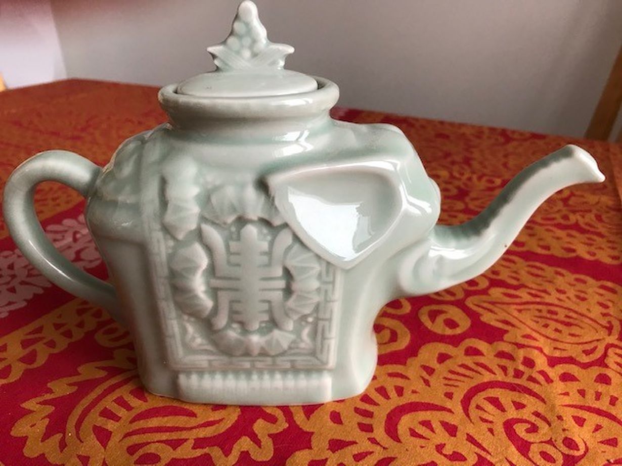 Ostin useita vuosia sitten kirpputorilta oheisen teepannun. Itse en edes juo teetä, mutta kerään norsuja ja ajattelin, että pitäähän norsujen keräilijällä olla myös norsuteepannu. Vieraille olen siihen muutamia kertoja teetä hauduttanut.