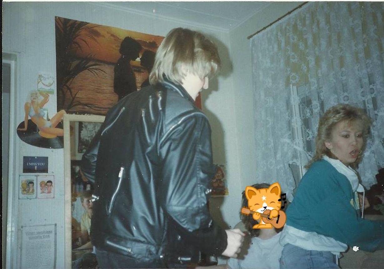 Siinä minä 80luvun alussa, peroxid blondatut hiukset. Kiharrettu, ja Levikset jalassa.