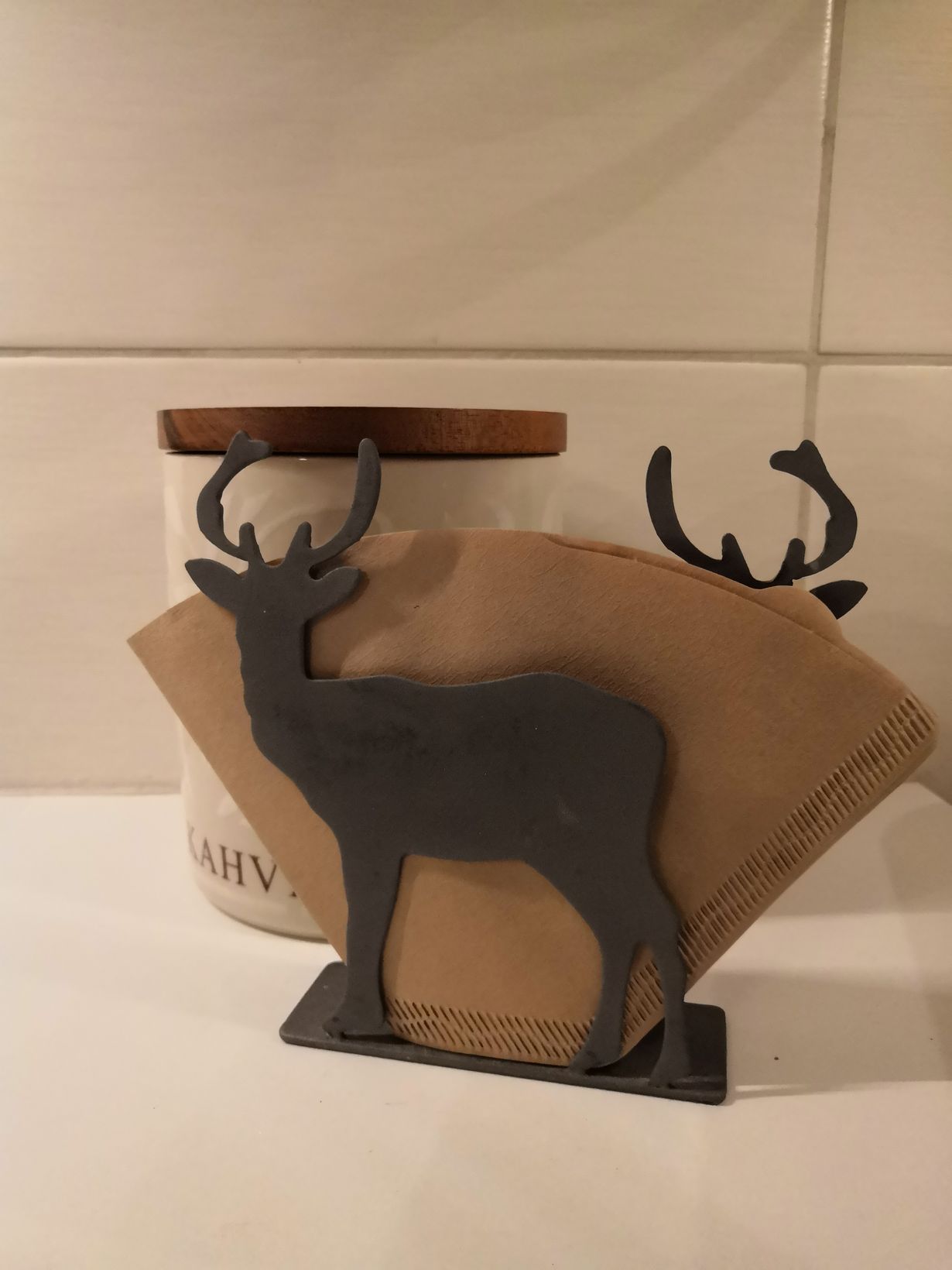 Meidän servettiteline on ostettu joskus jouluiseen kahvipöytään. Turhakkeena sitten jäännyt kaappiin, kunnes keksin säilyttää siinä suodatinpusseja.