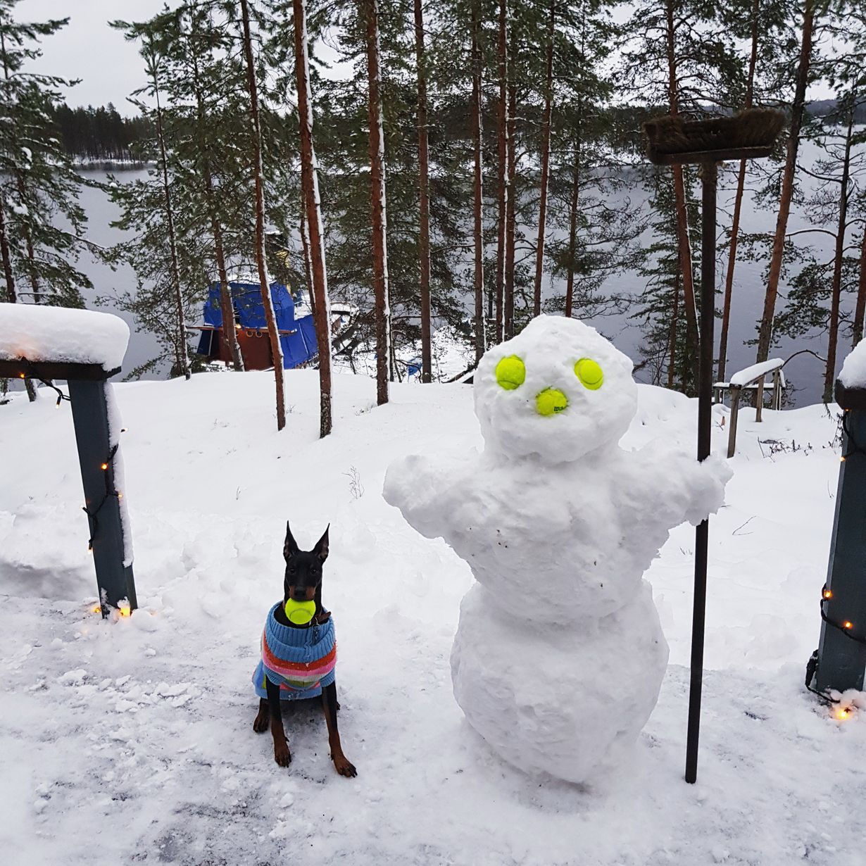 Heittelin koiralle tennispalloja mökillä. Kerran talvessa teen lumiukon, vaikka olenkin jo 35v. nainen. Englanninkääpiöterrieri Kunkku oli eri mieltä pallojen käytöstä :)