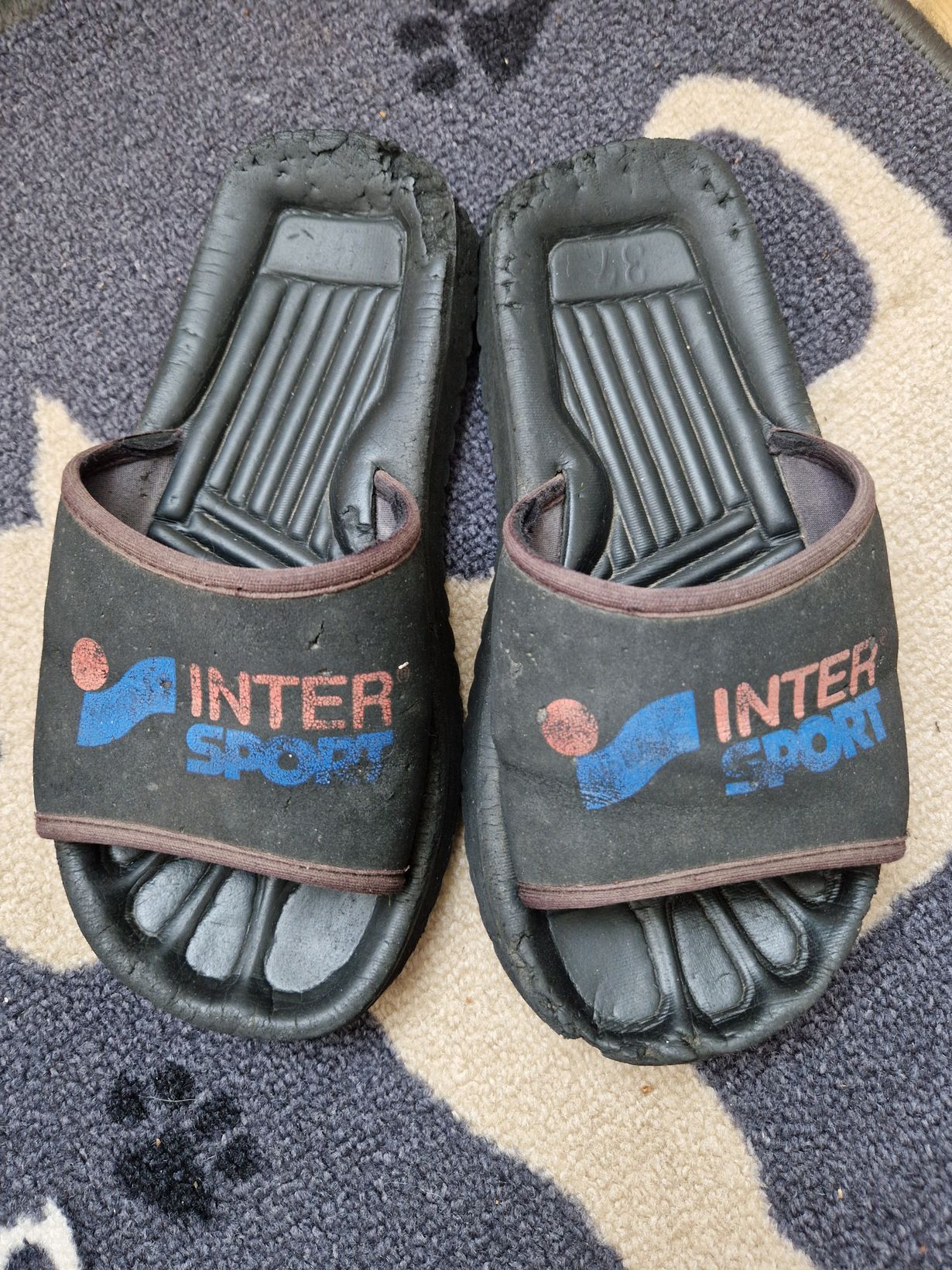 Tyttäreni harrasti kilpauintia ja tossut hankittiin hänelle uimahallikäyttöön. Koiranpentumme Nelli tykkäsi tossujen järsimisestä, mutta vielä ne kelpaavat terassikenkinä oikein hyvin.