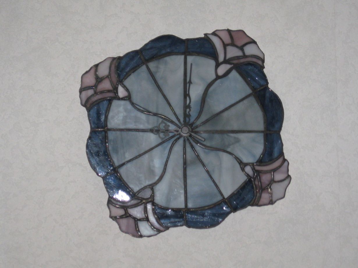 Tämä kello on itseni tekemä kansalaisopiston tiffanypiirissä.Olin harrastanut tiffanya vasta vuoden ennen tämän kellon tekoa.