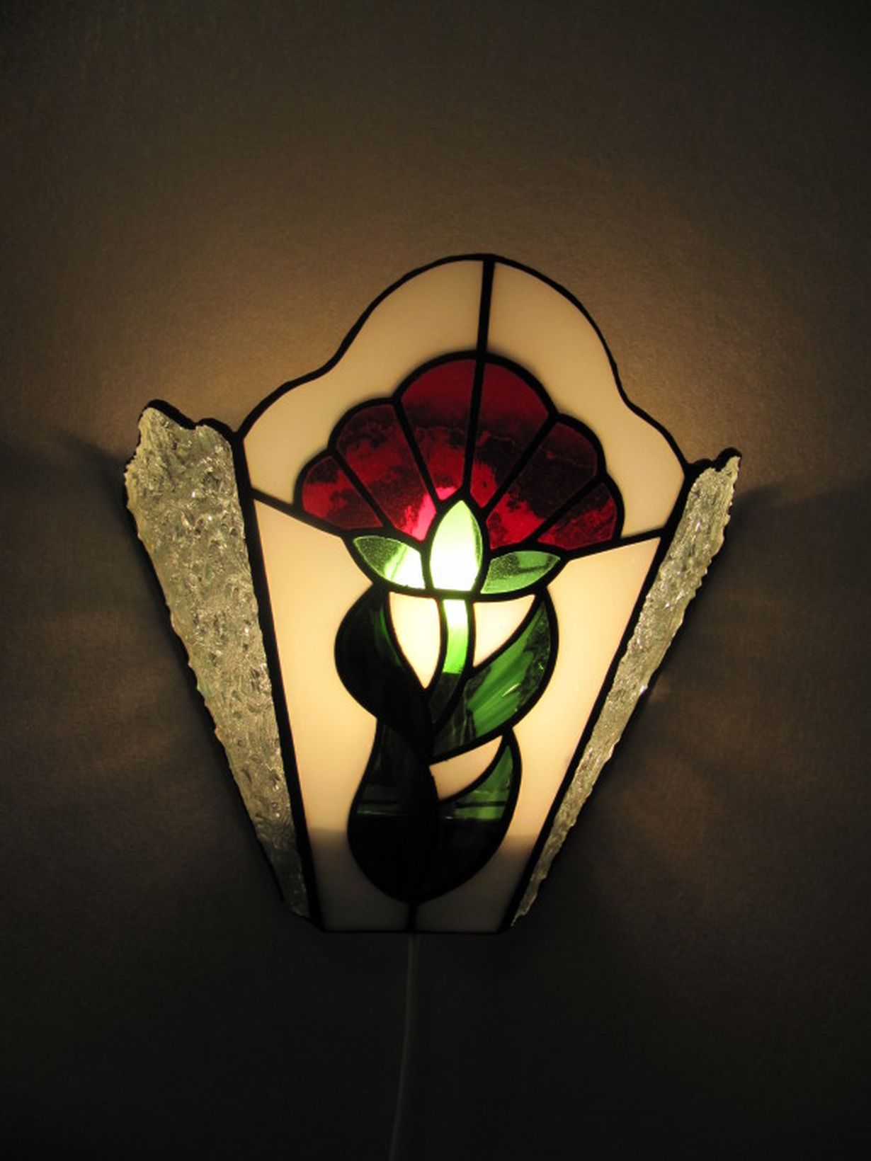 Harrastan tiffanytöitä.Eräässä kyläpaikassa näin tällaisen lampun. Ihastuin siihen niin kovin, että tahdoin sellaisen itselleni. Otin lampusta kuvan ja kuvan perusteella sain tehtyä samanlaiset kaksi lamppua itselleni. Olen onnellinen lampuistani ja ylpeä koska olenhan itse nämä tehnyt.