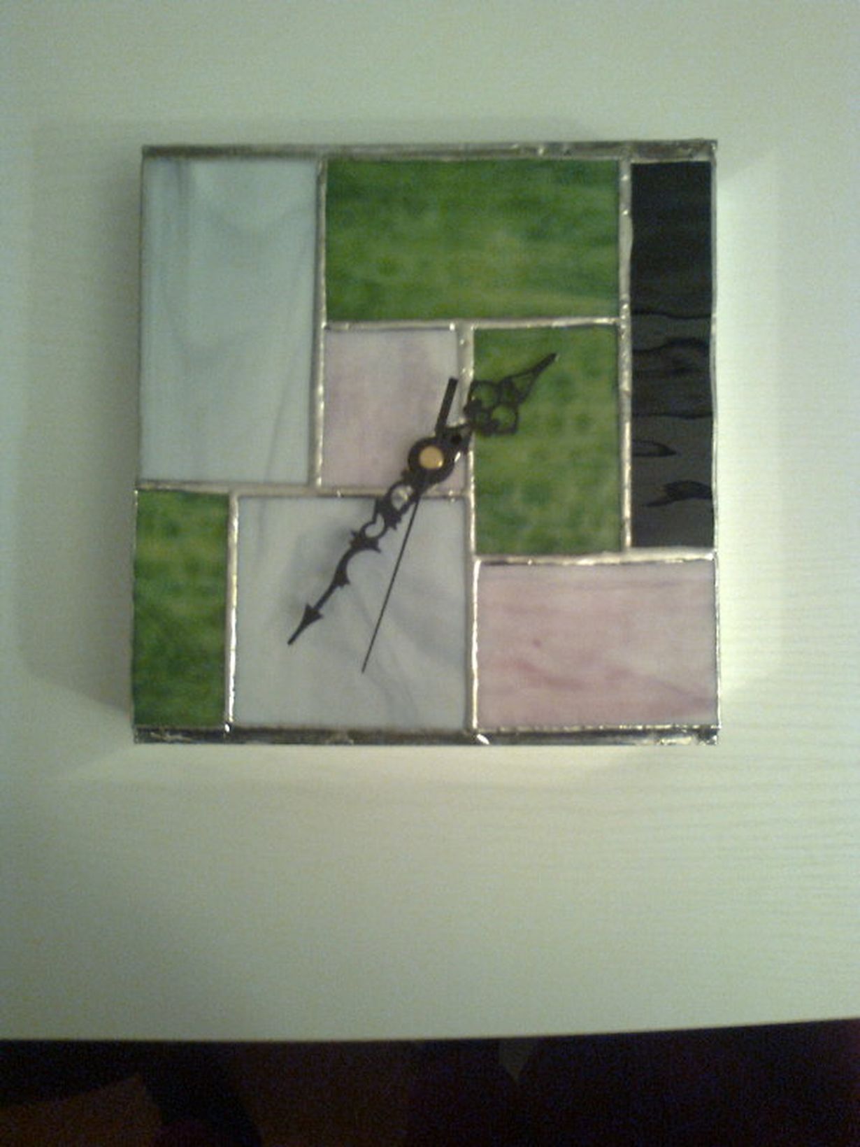 Tiffany-lasityönä itse tekemäni kello, jossa sivut on tehty peililasista. Kellokoneiston isäni antoi minulle, kun tiesin hänen rakentelevan pahkakelloja.