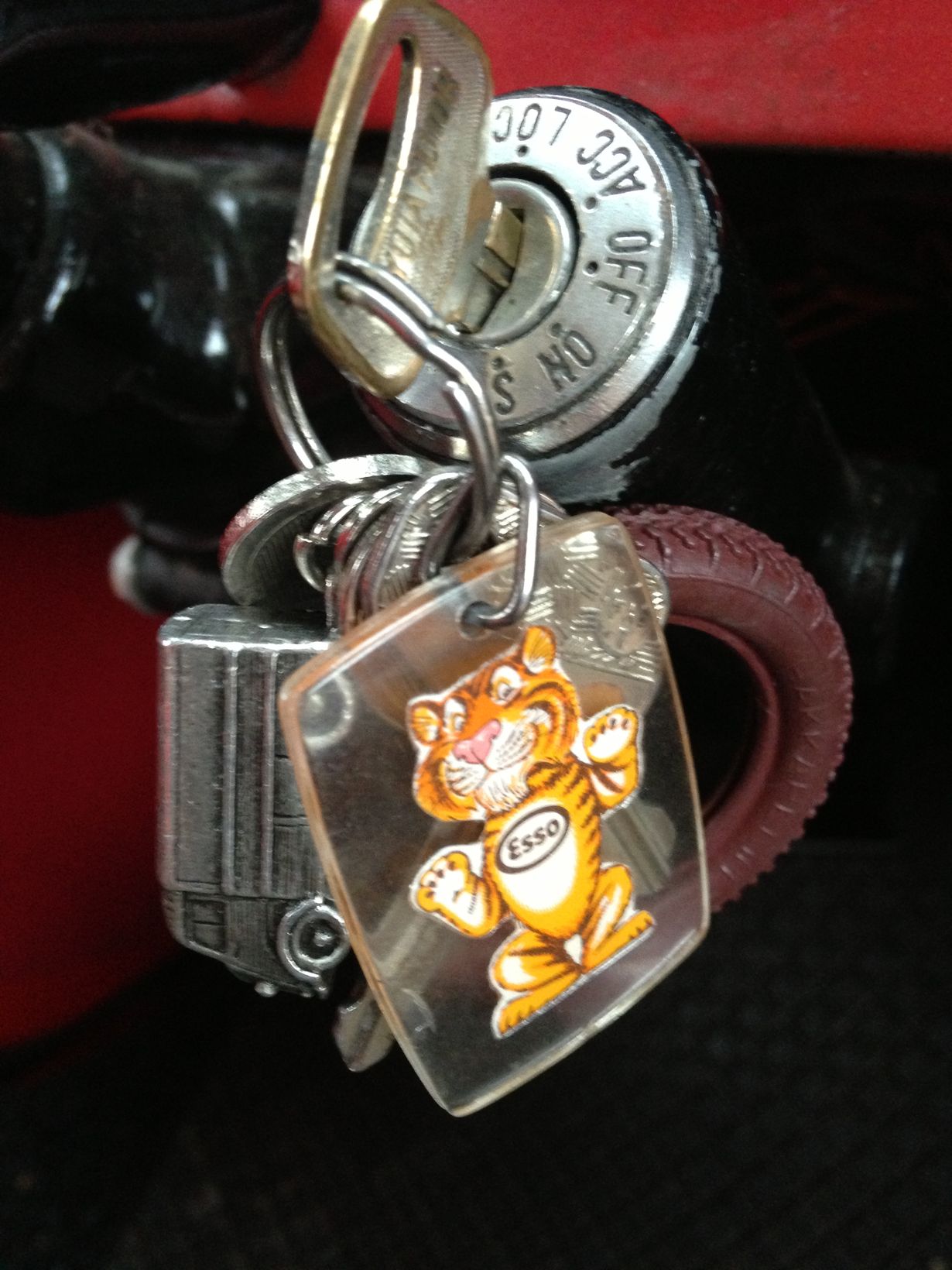 Retkeilyautomme (Citroën Type H eli suomalaisittain "Kamina") avaimenperinä Ranskasta tuliaisina saatu ajoneuvon pienoismalli sekä appiukon perintönä ajanmukaiset 70-luvun mainosperät, Esso-tiikeri (takapuolella tiikerin selkäpuoli) ja Nokia Hakkapeliitta-rengas.