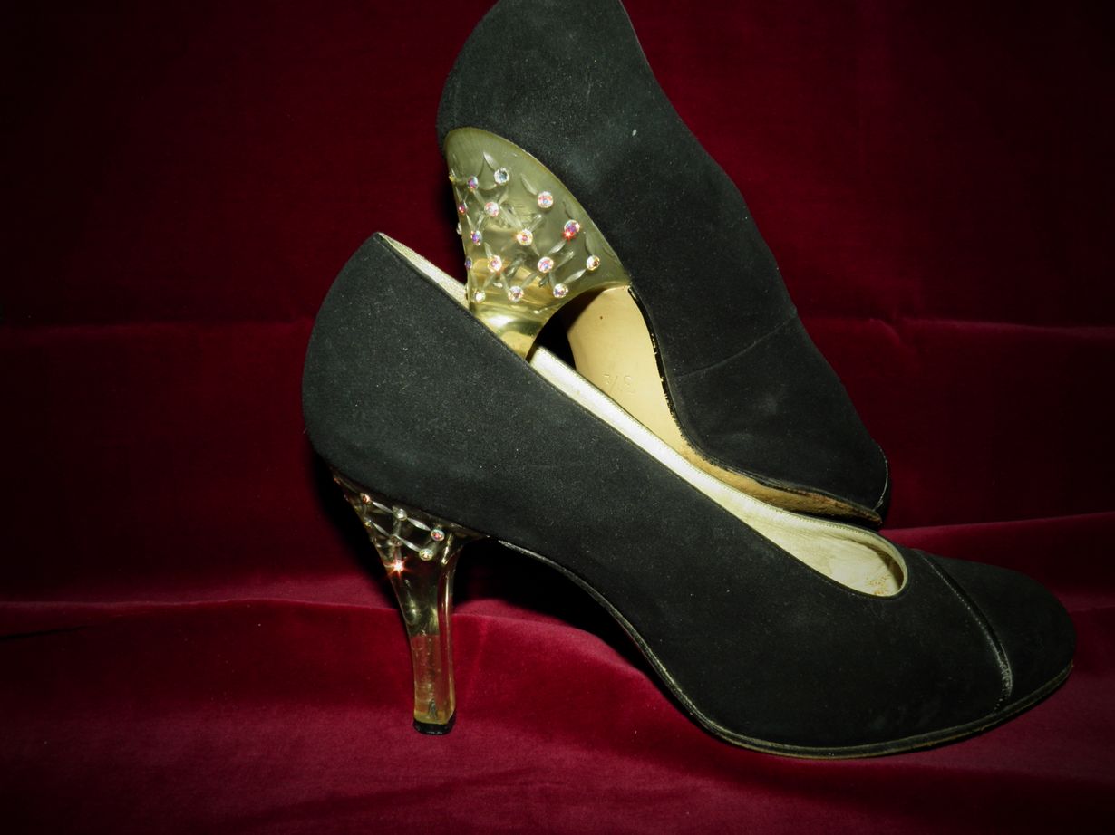 N.60 vuotta vanhat korkokengät olen perinyt äidiltäni. Ovat mustaa nupukkia ja nahkavuorilliset. Sisällä lukee kultaisella "kultamitali" (kotimaiset?). Korot kirkasta muovia, joissa "timantteja". Pidin niitä nuorena juhlissa, mutta eivät enää mahdu jalkaani. Varjelen niitä tarkasti.