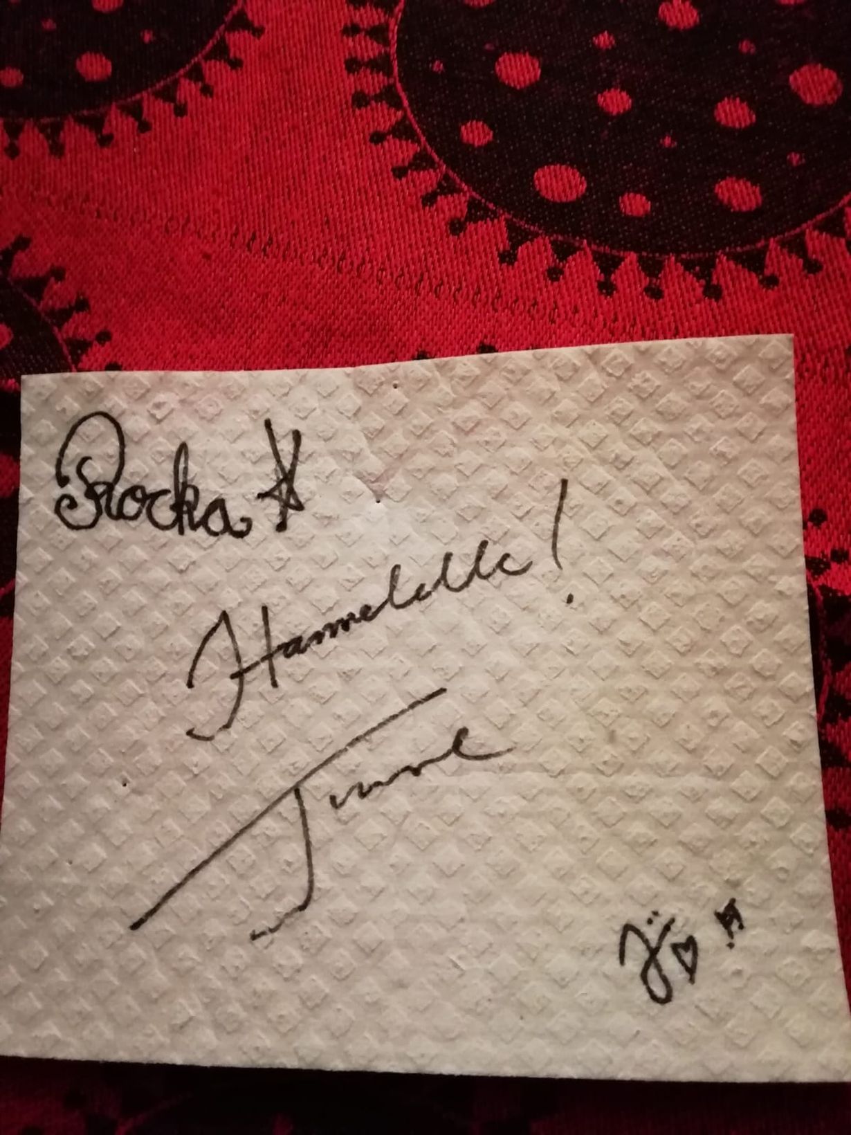 Olin äitini kanssa suosikkimme Tuure Kilpeläisen ja Kaihon Karavaanin keikalla kesällä 2016. Mahtavan keikan jälkeen piti vielä piipahtaa naistenhuoneessa ja kuinka ollakaan Tuure ja bändin pojat kirjoittivat nimmareita aulassa. Mukana ei ollut mitään paperia, joten ostin salamana heidän fanituotteidensa joukosta tiskirätin, johon sain Tuuren, Jirin ja Rockan nimmarit. Tiskirätin paikka on muistona seinällä, ei tiskialtaassa.