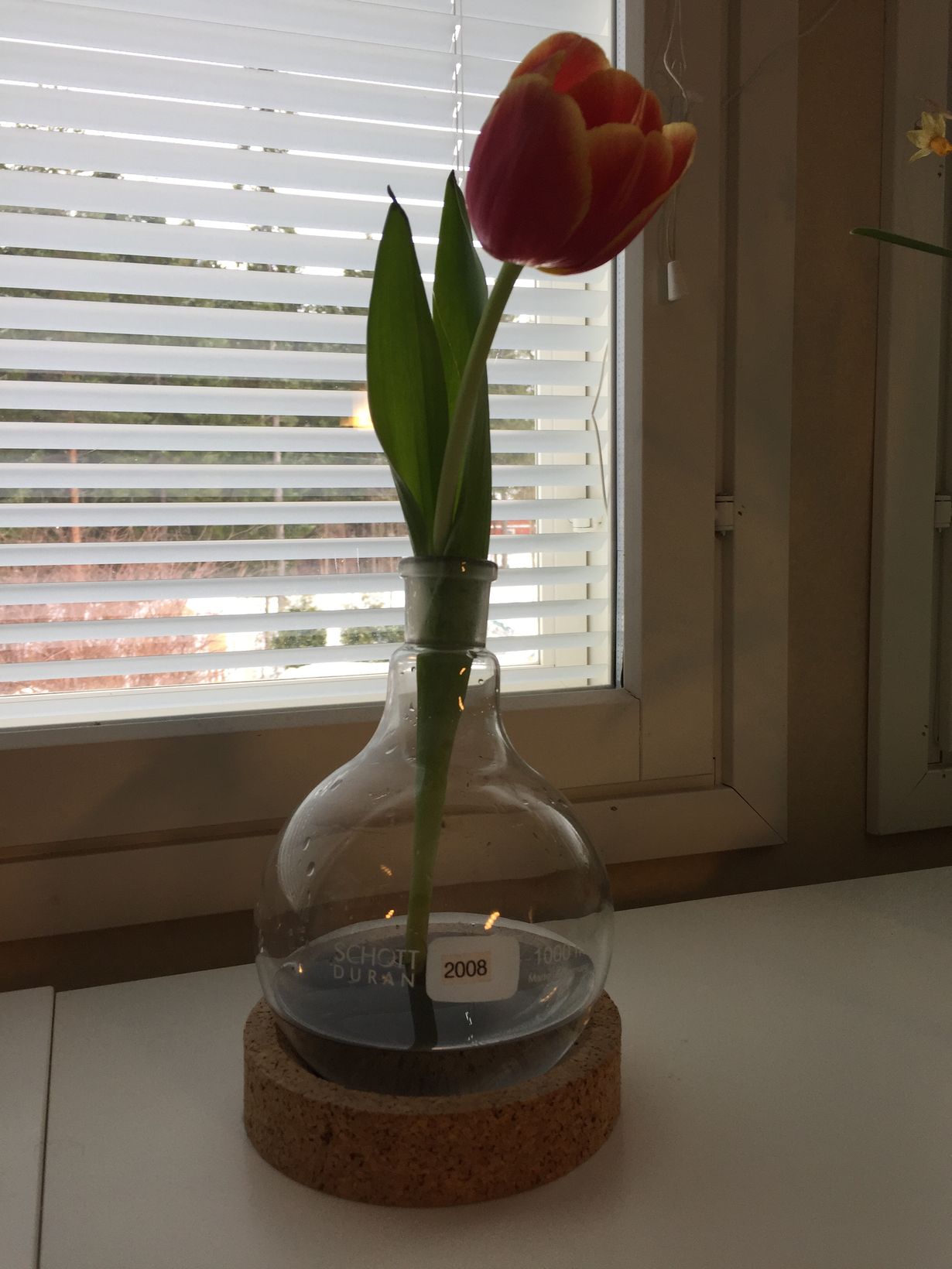 Mieheni väitteli tohtoriksi 2008. Työtovereiltaan hän sai mm. käyttämänsä tislauspullon, joka sai meiltä paikan kukkamaljakkona. Rouhean kaunis, vähän erilainen mutta lämpimiä muistoja herättävä pieni arjen ilahduttaja!