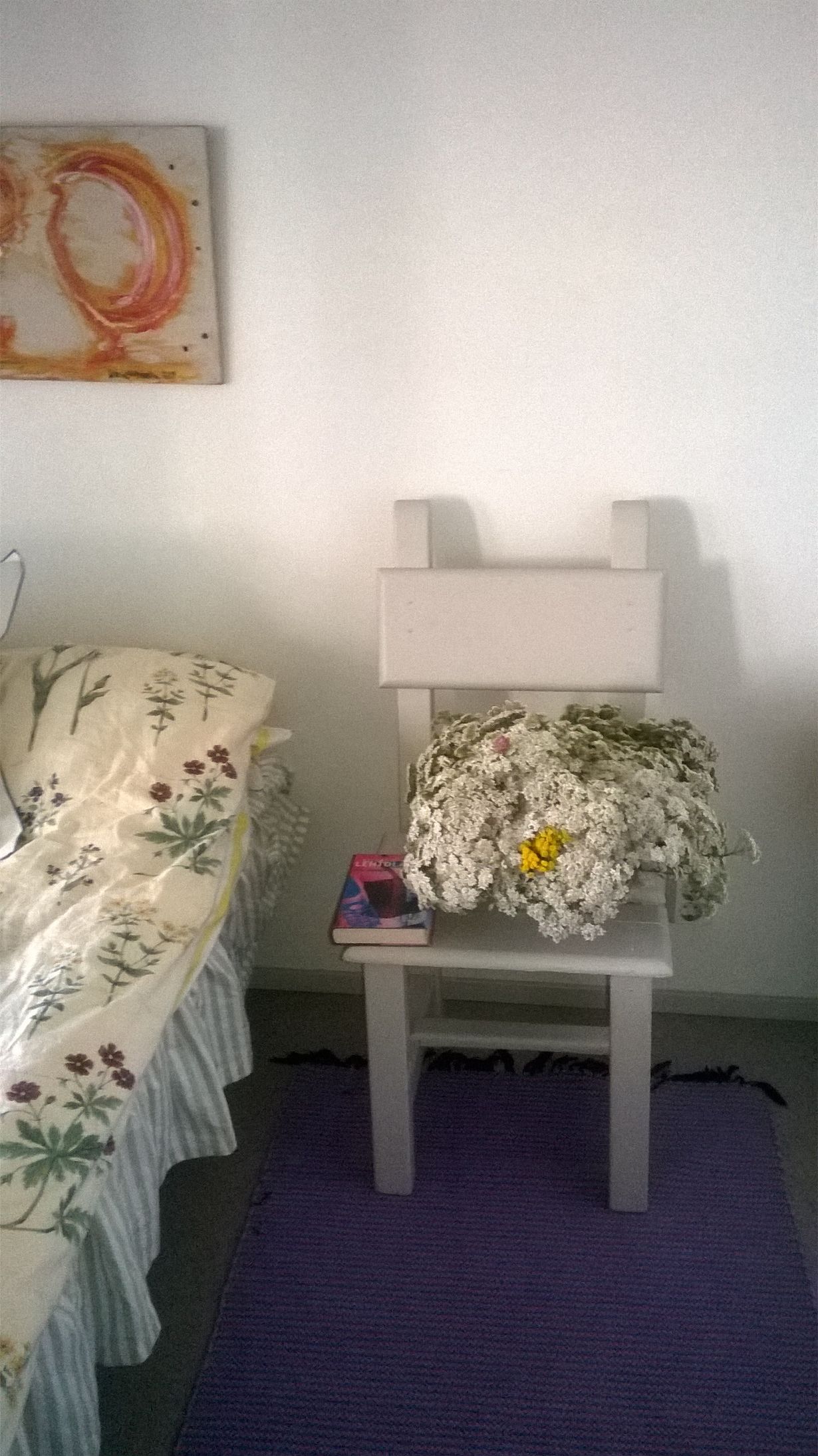 Löysimme tämän yksinäisen tuolivanhuksen purettavan rakennuksenpihalta. Mieheni kunnosti ja maalasi sen ja nyt se hoitaa vallanmainiosti yöpöydän tärkeitä tehtäviä.