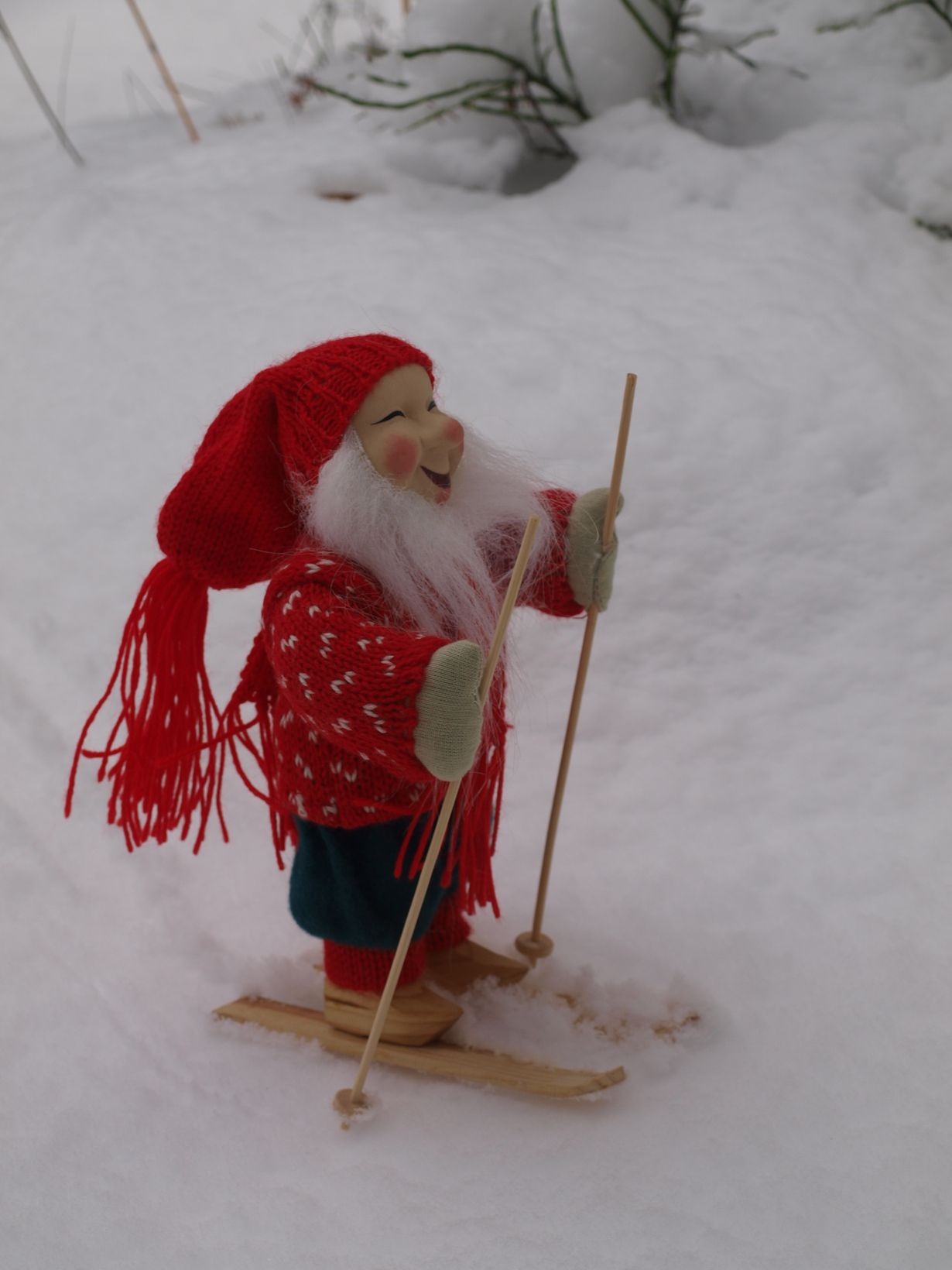 Tämä tonttu halusi mukaani Vanhan Ylioppilastalon joulumyyjäisistä noin vuonna 1999. Hän oli kallis, mutta on kotimaista käsityötä, puusukset ja kaikki! Joka joulu hän hiihtää sohvapöydälle ja tässä kuvassa tonttu pääsi joulukorttiin.