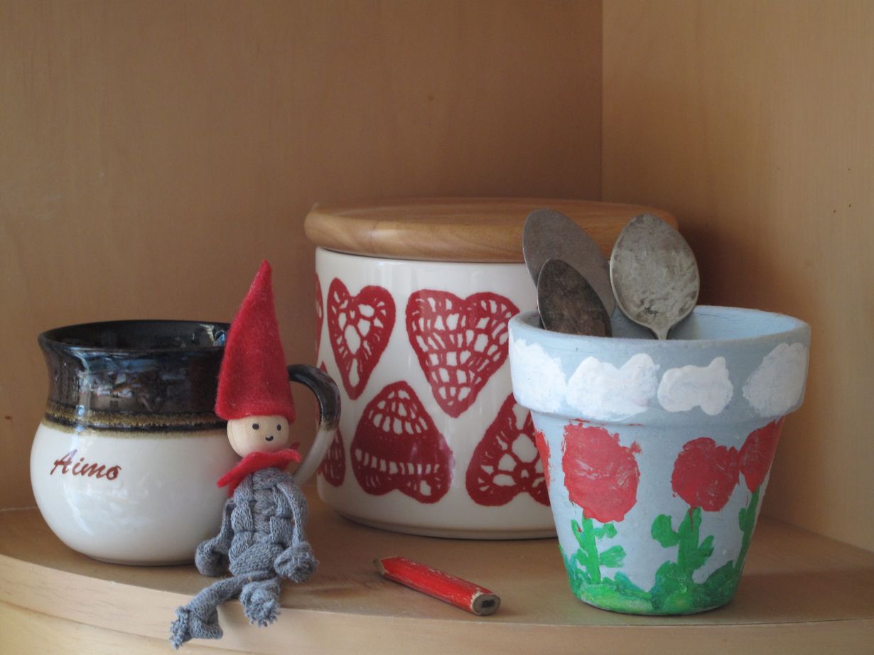 Tämän tontun askartelin muutama vuosi sitten Tampereen kädentaidot-messuilla. Se on minulla keittiössä esillä ja jaksaa ilahduttaa edelleen. Oikealla olevan kukkaruukun yrttimerkkeineen askarteli lapsi aikoinaan tarhassa.