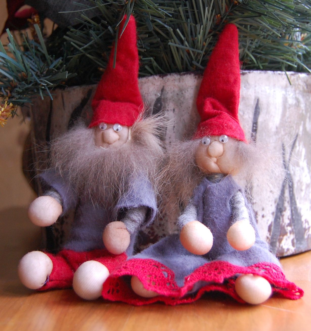 Näitä itse askarreltuja tonttuja istuskelee ja kiipeilee joulun aikaan joka puolella taloa.
