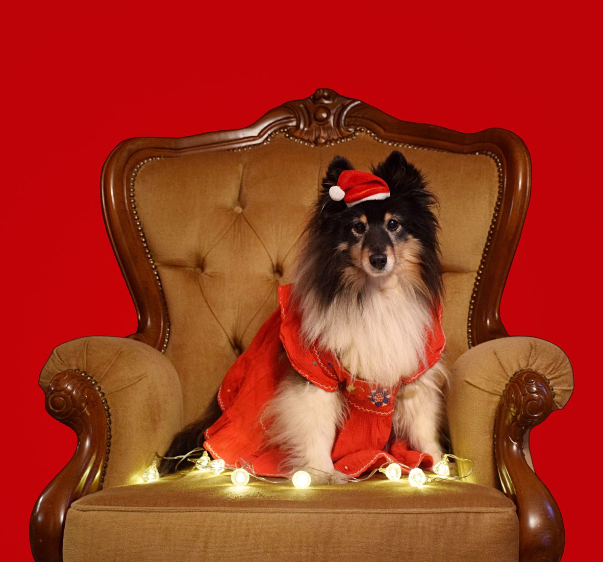 Jo edesmennyt shetlanninlammaskoirani Villiina oli pennusta asti tottunut toimimaan valokuvamallina. Tämän kuvan teimme joulukortiksi vuonna 2020. Mekko on sama, johon itse pukeuduin pikkutyttönä.